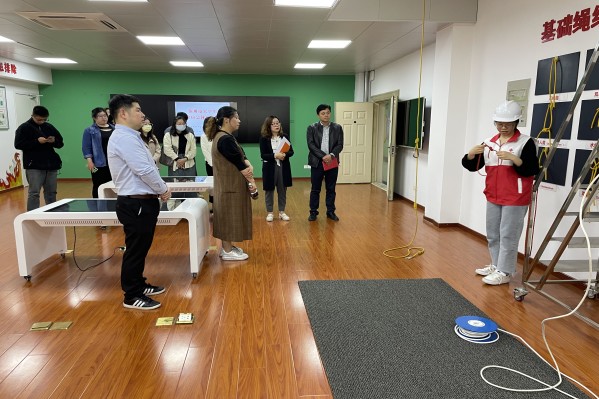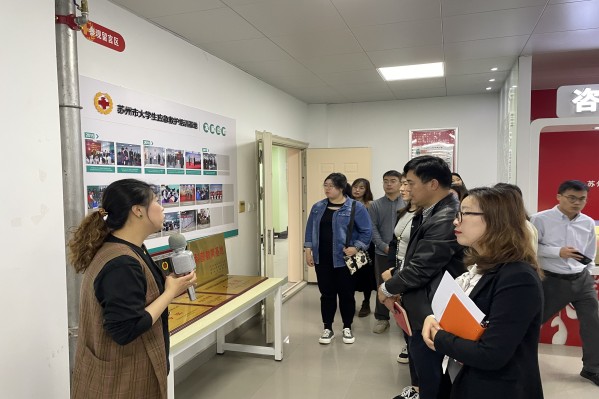 高新区红十字会常务副会长、高新区红十字会戴晓雯、苏州高博软件技术职业学院学生处副处长兼学生健康中心主任王琴、各二级学院辅导员代表一行首先来到了苏州市大学生应急救护培训基地、苏州市大学生安全应急体验馆。苏州职业大学团委老师刘诗琪对基地的设备设施、急救培训课程、应急逃生课程等方面进行了介绍。