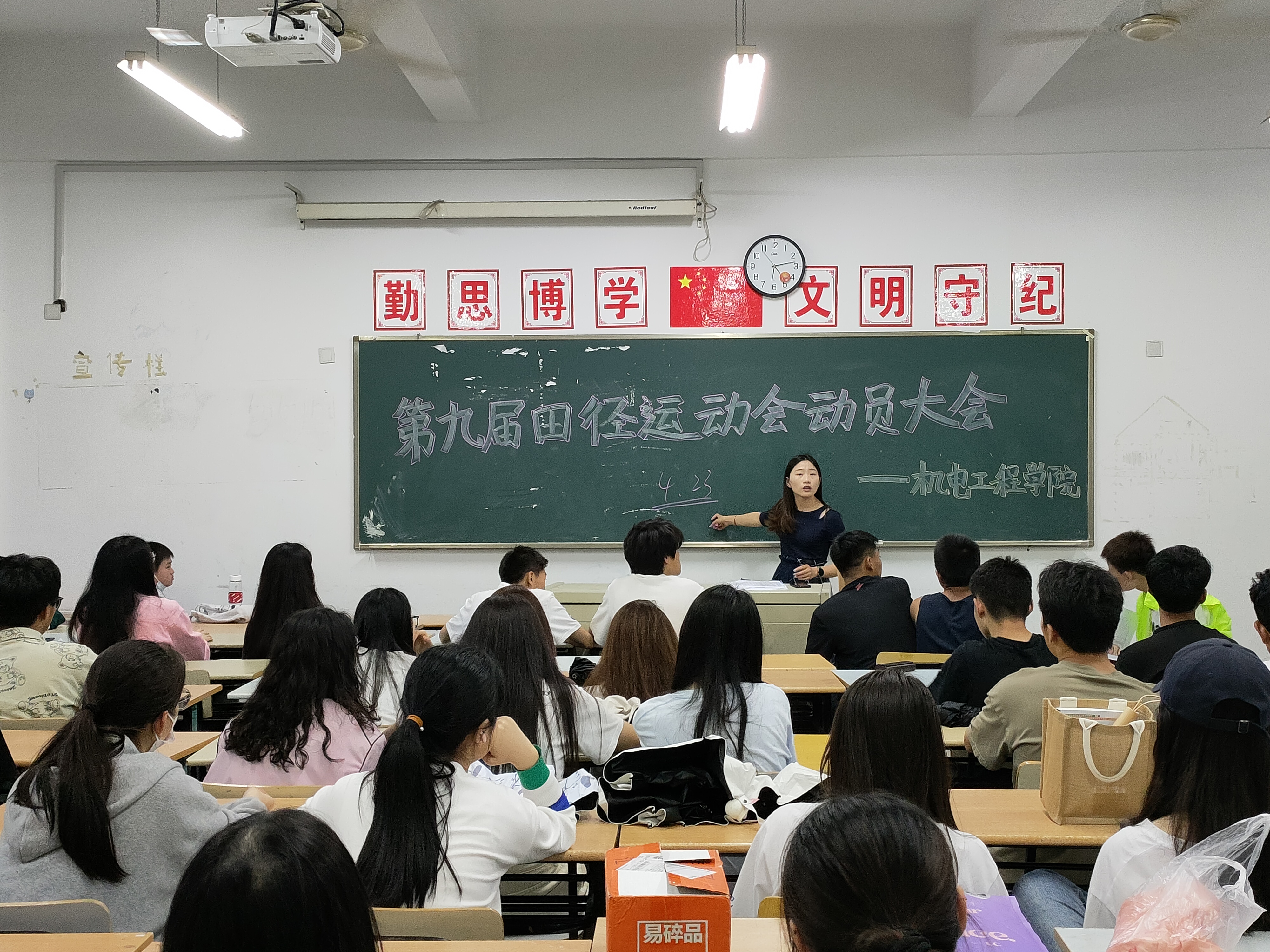 在学校第九届田径运动会即将来临之际,为充分调动运动员的积极性,同时保障比赛期间各项服务工作有序进行。2023年4月18日18:00,机电工程学院在教学楼12-302召开田径运动会动员大会。本次大会由机电工程学院分团委书记孙宇珊老师主持,机电工程学院全体参赛运动员和志愿者们认真听讲。
