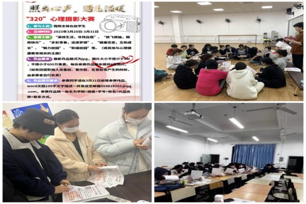 各二级学院开展特色宣传教育活动,人文社会科学学院以“悦纳自我,拥抱阳光”为主题开展了心理摄影大;艺术与建筑学院以“我想为你画,画解心情”为主题开展了绘画比赛;机电工程学院以“折里相遇 从心开始”为主题开展了折纸活动;信息与软件学院以“春光漫漫,心心向荣”为主题开展了心理摄影比赛、电影赏析;国际商学院以“初春去赶集”主题开展了心愿卡片活动;医学与公共服务学院以“坚韧之美,你我同行——Fly Soul从心开始”为主题开展了放风筝这一同学们喜闻乐见的活动;通过以上活动,各学院充分发挥自身专业与心理相融合,完成了心理健康教育周系列活动,做到班班有活动,人人能参与,营造暖心安全的校园文化活动氛围。