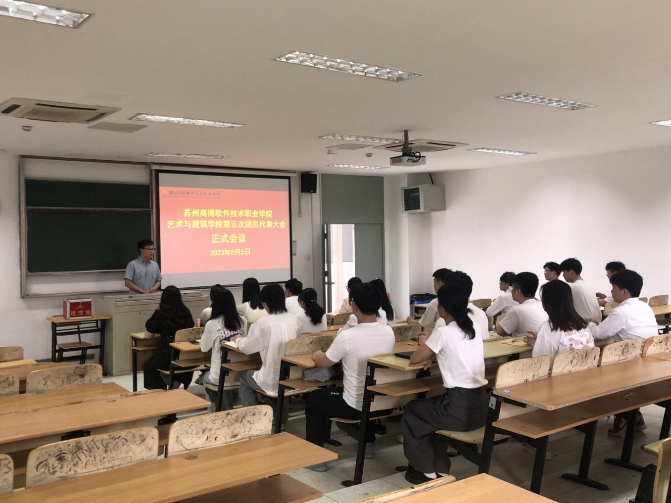 5月4日下午,在艺术与建筑学院党总支领导关心支持下,苏州高博软件技术职业学院艺术与建筑学院第五次团员代表大会在12楼-206教室召开。出席此次大会的有:党总支副书记纪冰心,学生党支部书记、学工办主任李一帆,分团委书记韩露,各年级辅导员朱辰燕、何婷婷、孙刚以及22名学生代表。本次会议由郭欣豪同学主持。