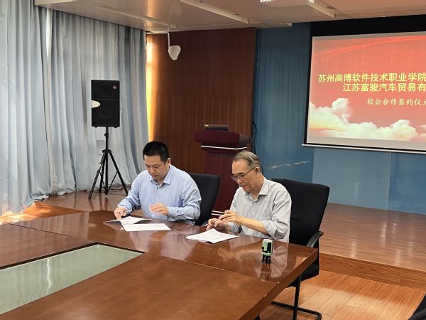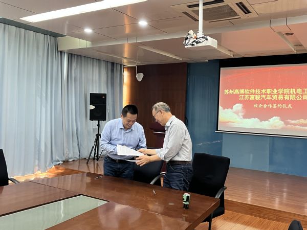 5月26日下午,机电工程学院与江苏富骏汽车贸易有限公司校企深度合作签约仪式在实训楼会议室隆重举行。机电工程学院院长蔡伟义、机电工程学院师生代表,以及江苏富骏汽车贸易有限公司的执委会特别助理郑宜泓、人事科长郑海飞、服务经理张其伟等共同出席了签约仪式。