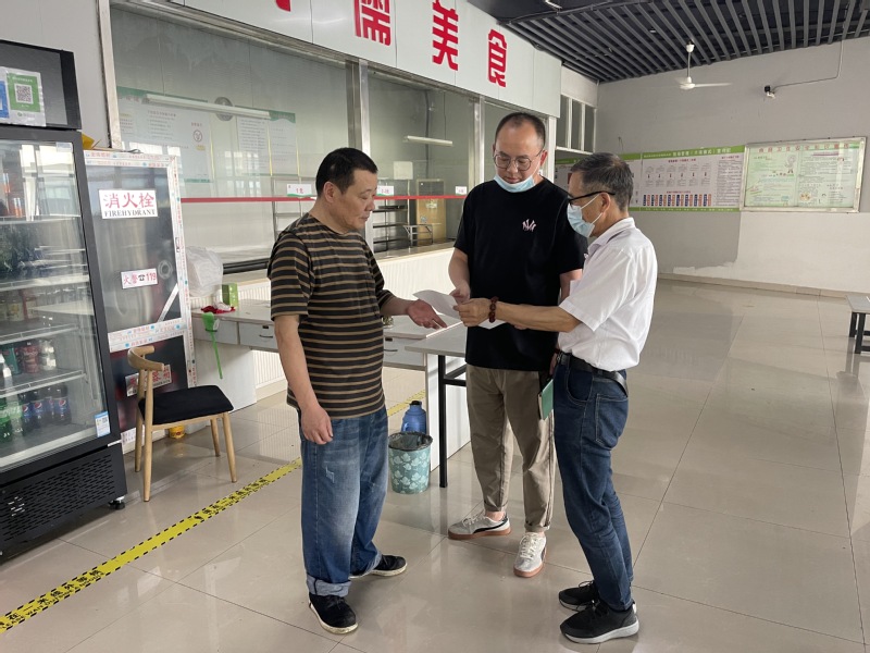 后勤管理处副处长潘新法、处长助理张宏虎仔细察看了食堂后厨操作间卫生状况、原料采购和贮存、食品加工操作流程、食品留样记录、清洗消毒等情况,详细询问食堂管理人员和工作人员了解情况,对存在的问题立即提出整改要求。