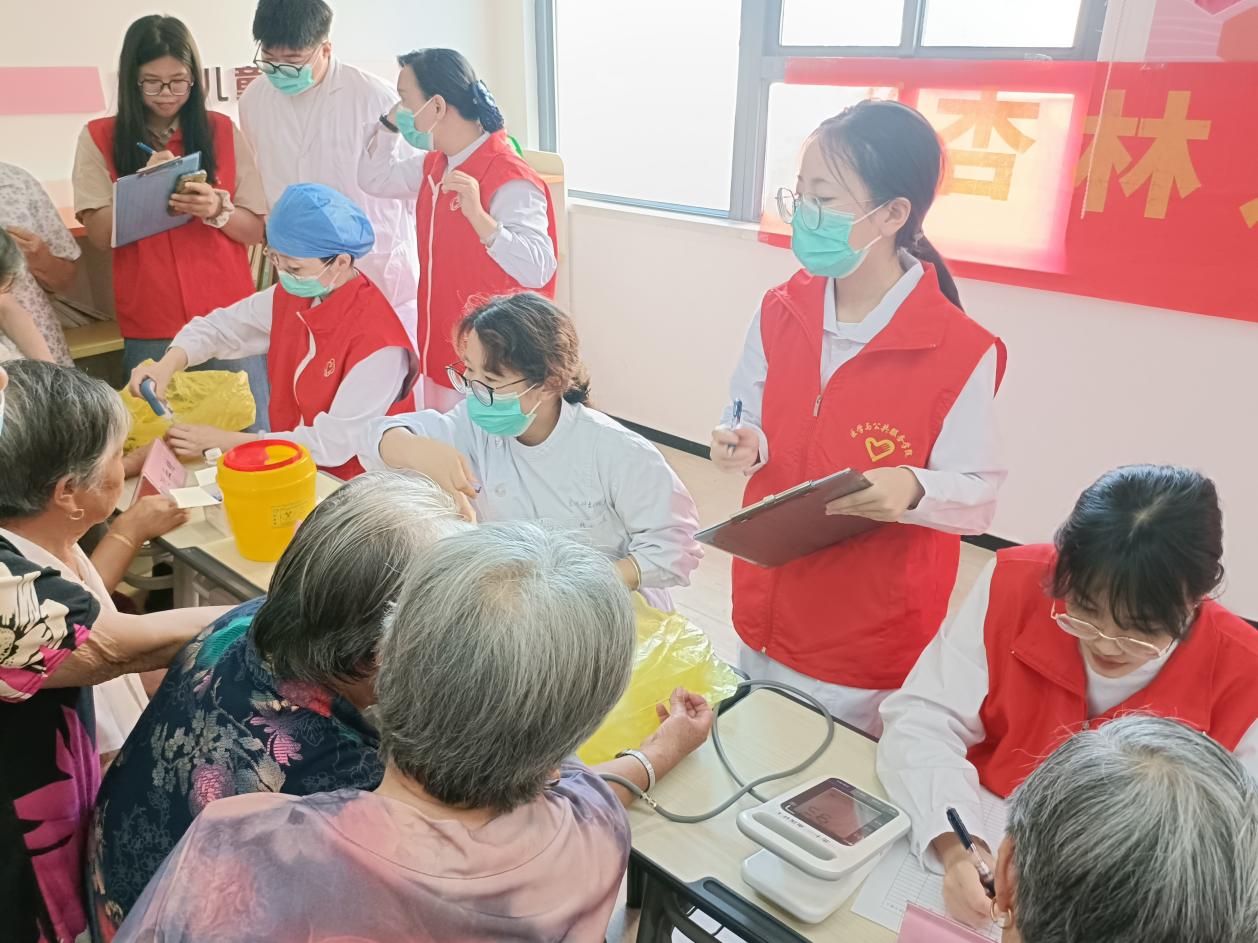 活动现场,社区居民前来参加义诊,其中老人居多,志愿者积极配合医生,告知老人夏季注意事项,了解老人近期身体情况。志愿者们耐心回答居民咨询的各种问题,为其测血压、测血糖,询问既往病史并告知生活中的注意事项。
