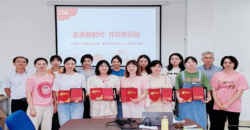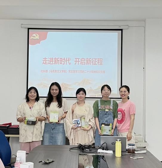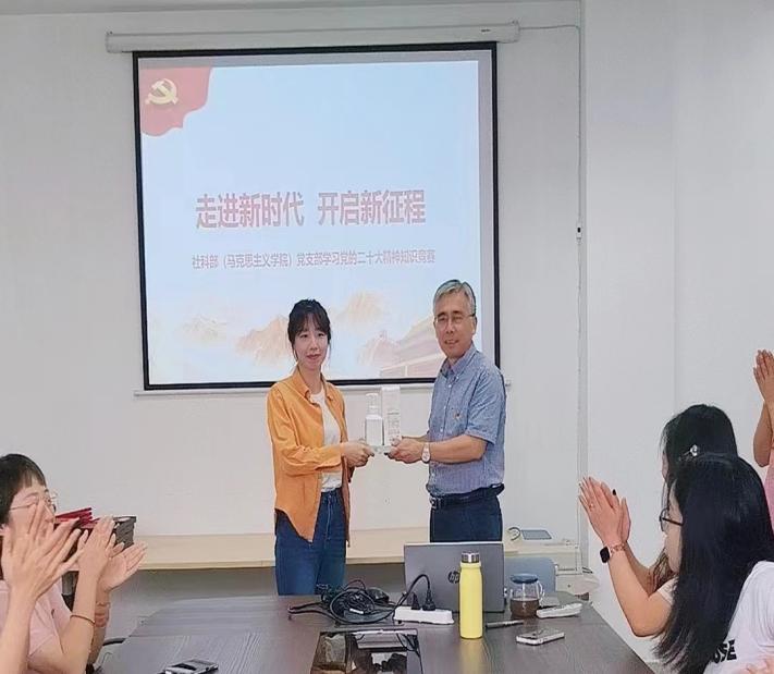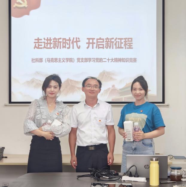 为深入学习宣传贯彻党的二十大精神,强化思想引领,营造良好的学习氛围,推进党的二十大精神深入人心,激励思政教师在学深悟透中奋发前行,也为庆祝第39个教师节,人文学院社科部(马克思主义学院)党支部于9月15日下午举行“走进新时代,开启新征程”--学习贯彻党的二十大精神知识竞赛活动。社科部党支部全体党员参加,本次活动由支部组织委员陈丽侠主持。