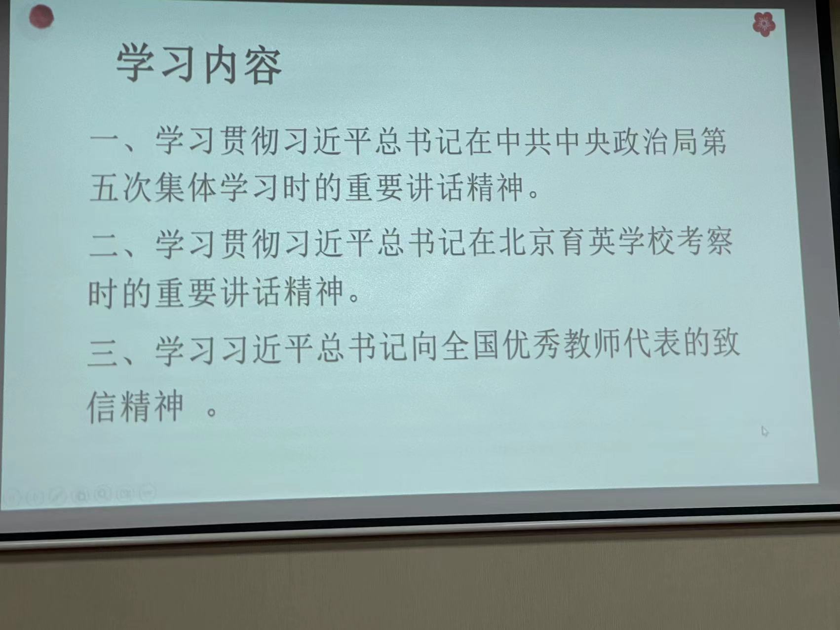会上,院党总支书记吴建明首先带领全体教职工学习了习近平总书记2023年5月29日在中共中央政治局第5次集体学习时的重要讲话精神、2023年5月31日在北京育英学校考察时的重要讲话精神、2023年9月9日向全国优秀教师代表的致信精神。吴建明强调,学院全体教职员工要深入学习领会习近平总书记系列重要讲话精神,围绕培养什么人、怎样培养人、为谁培养人这个教育的根本问题,坚持不懈用习近平新时代中国特色社会主义思想铸魂育人,着力加强社会主义核心价值观教育,引导学生树立坚定的理想信念,永远听党话、跟党走,培养一代又一代德智体美劳全面发展的社会主义建设者和接班人。作为一名光荣的人民教师,我们要具有“心有大我、至诚报国的理想信念,言为士则、行为世范的道德情操,启智润心、因材施教的育人智慧,勤学笃行、求是创新的躬耕态度,乐教爱生、甘于奉献的仁爱之心,胸怀天下、以文化人的弘道追求”的中国特有的教育家精神。他希望老师们要以习近平总书记提出的“有理想信念、有道德情操、有扎实学识、有仁爱之心”的“四有”好老师的标准严格要求自己,为党育人、为国育才,自信自强、踔厉奋发,为强国建设和民族复兴伟业作出应有的贡献。