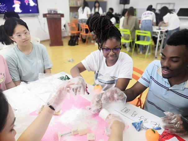 9月27日下午,国际学院与人文学院联合举办了“迎中秋,叙友谊”主题活动。来自加勒比国家的10名留学生与外语系20余名中国学生欢聚一堂,共迎中秋。活动期间,中国学生向留学生们介绍了中秋节的起源和习俗,并通过“步步生花”、“击鼓传音”等互动游戏,教留学生朗读有关中秋的成语,向留学生解释成语中的美好寓意。随后,中外学生还纷纷拿起工具,兴致勃勃地制作属于自己的月饼。看到一个个小巧精美的冰皮月饼在大家手中诞生,留学生们无比激动、兴奋,纷纷捧起月饼与中国学生合影留念。