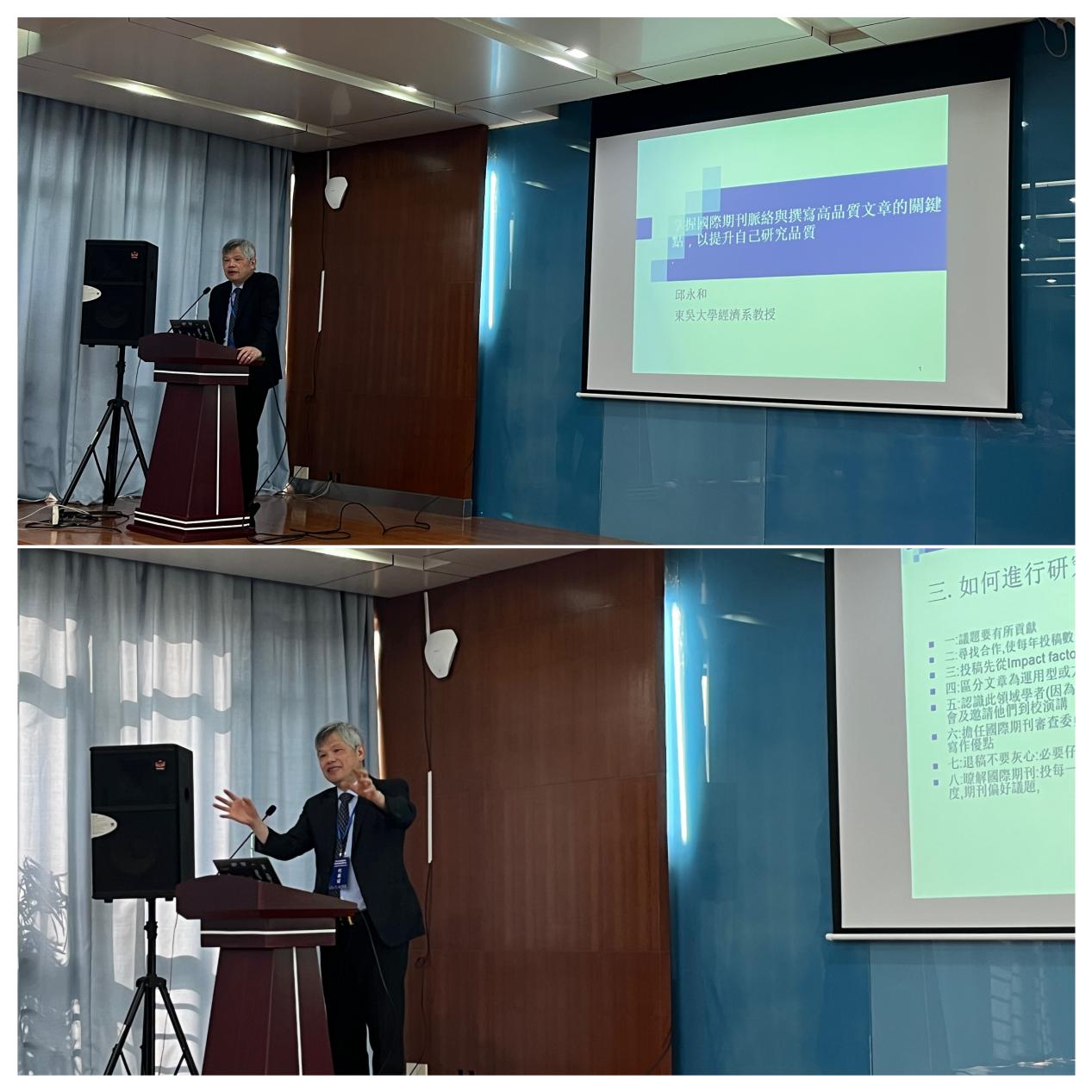 2023年10月20日下午1点,台湾东吴大学邱永和教授应邀前来beat365官网为国际商学院老师作了题为“掌握国际期刊脉络与撰写高品质文章的关键点,以提升自己的研究品质”的学术讲座。讲座由国际商学院特聘教授罗正英主持,全体教师参加了本次学术讲座。