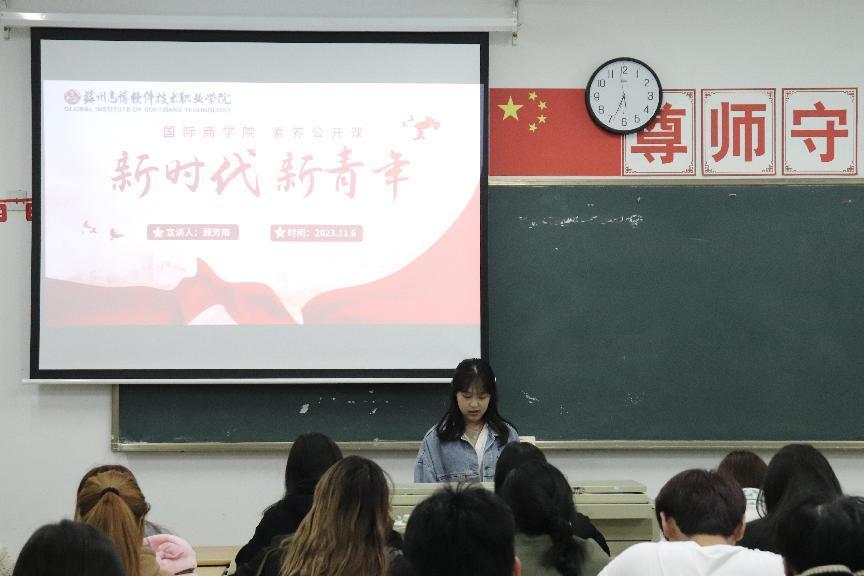 为深入学习宣传贯彻习近平新时代中国特色社会主义思想和党的二十大精神,持续加强学生的学习行动力,2023年11月6日晚7点,在大一晚自习教室围绕“新时代,新青年”开展了新思想公开课。本次公开课由学生会组织建设部部长顾芳雨同学主讲。