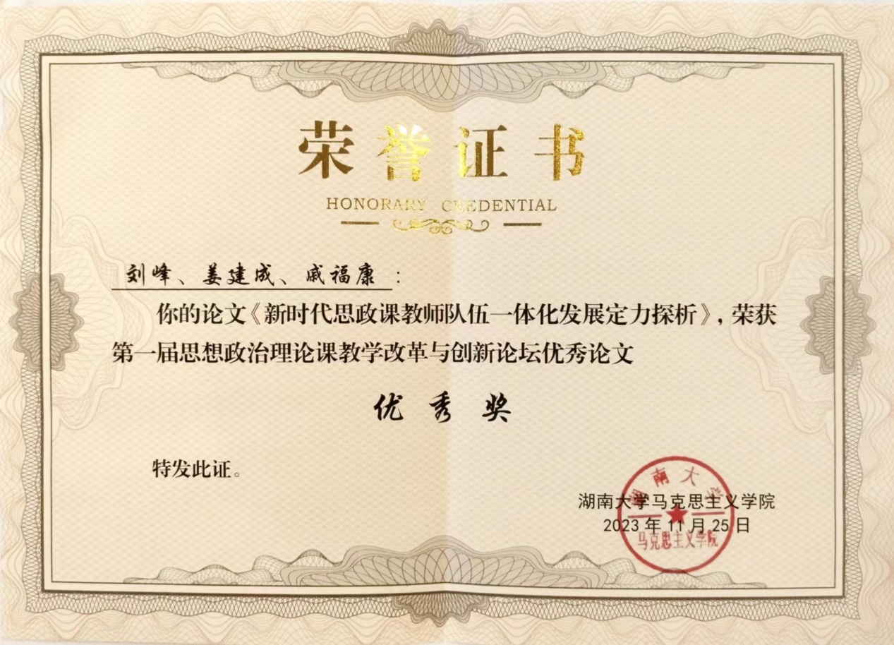 为深入学习贯彻党的二十大精神,深刻把握习近平总书记关于加强和改进高校思想政治教育的重要论述,不断提升高校思想政治理论课教学质量,湖南大学马克思主义学院和北京师范大学思想政治工作研究院于2023年11月24-26日在湖南长沙举办思想政治理论课教学改革与创新论坛。beat365官网马克思主义学院刘峰老师受邀参会,论文《新时代思政课教师队伍一体化发展定力探析》获评为优秀会议论文。