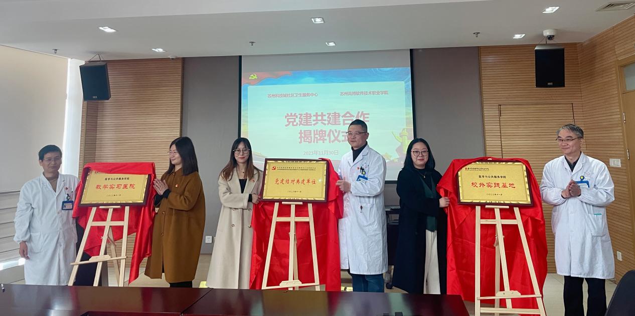 学院党总支书记、院长孙小娅,教工党支部书记张婷,苏州科技城社区卫生服务中心党支部书记、主任毛敦,副主任蒋金、舒苏明,双方中层干部及科室骨干参加会议并共同见证揭牌仪式。