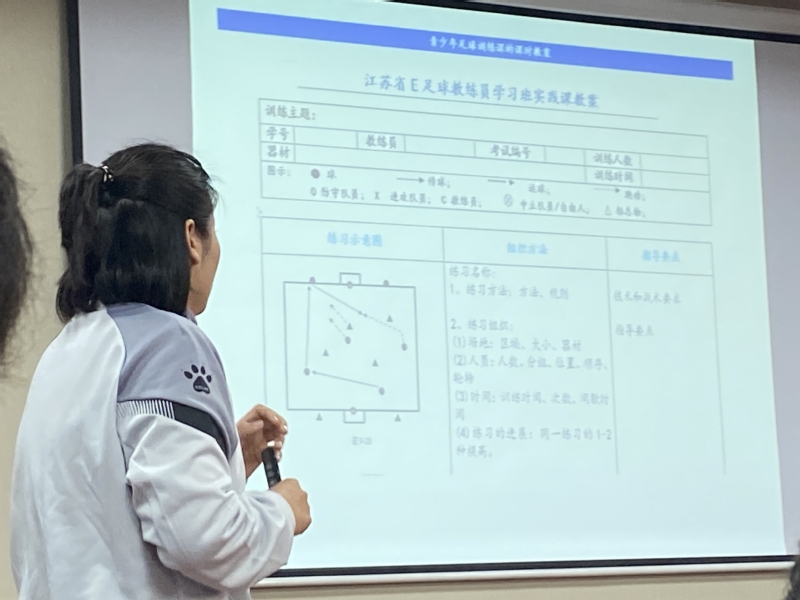 实践课部分,针对球感、运球、突破协调灵敏、传球、接球、控球、射门等主题,进行了训练课设计和实践演示。演示过后,讲师对演示过程中的优点与问题进行点评、分析和指导,并就相同主题进行训练课示范。