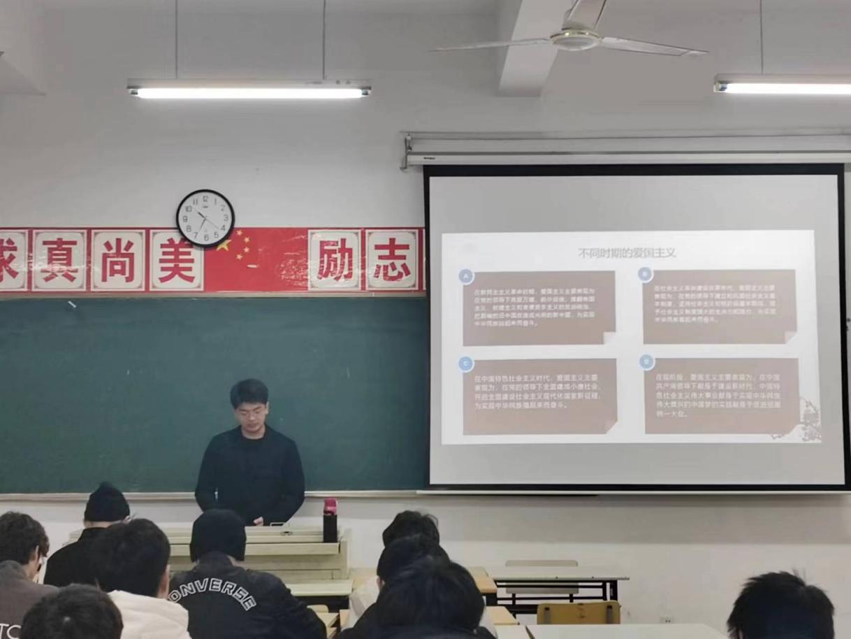 公开课上,孙向羽同学以百年来中国共产党带领中国人民所进行的一切奋斗为切入点,从维护祖国统一、民族团结,传承中华民族传统历史文化,坚持立足中国又面向世界等方面对新时代爱国主义进行阐述,让大家充分意识到爱国的重要性,作为时代青年应该勇担时代赋予的使命,勇往无前,为实现中华民族伟大复兴不懈奋斗。