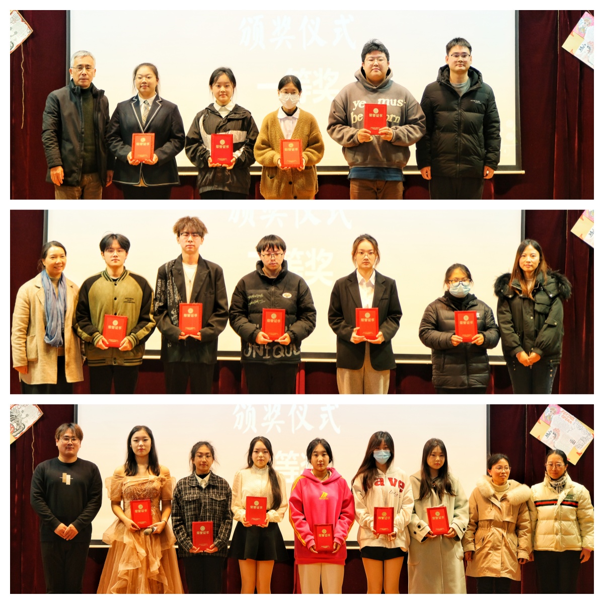 在外语文化节闭幕式上首先举行颁奖活动。参加活动的领导和嘉宾分别为在配音朗诵比赛、外文书写大赛、英语口语比赛、外文歌曲大赛中获奖的优秀选手颁发证书,大家共同见证了这一荣耀时刻。