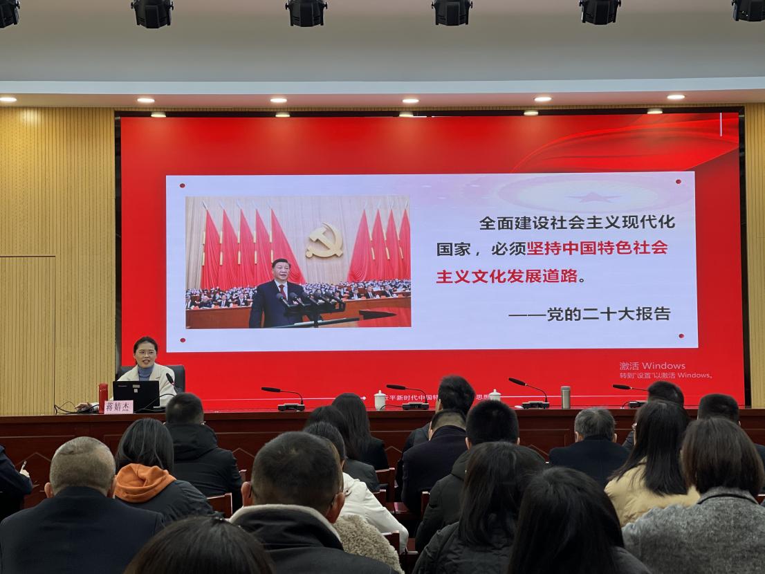 蒋婧杰老师此次宣讲主题为“推进文化自信自强 铸就社会主义文化新辉煌”。蒋老师从“准确把握社会主义文化自信自强的深刻内涵”、“新时代文化建设取得辉煌成就与面临深刻变化”、“在文化强国建设中铸就社会主义文化新辉煌”三个部分展开宣讲。在第一部分,蒋老师首先和与会党员干部交流了文化的内涵及文化对国运兴衰的影响,通过回顾近代中华文化由衰微走向重振的艰难历史过程,阐明文化对国家发展的重要意义。接着,蒋老师通过列举从古至今的大量案例,进一步指出中华民族在不屈不挠的奋斗发展中创造的优秀传统文化、革命文化和社会主义先进文化正是我们文化自信的底气;第二个部分,通过分析新时代十多年来社会主义文化建设取得的五个方面辉煌成就和面临的三个方面深刻变化,结合十多年来的大量案例,着重阐述了新时代以来我国社会主义文化建设的现状;第三个部分,分析了社会主义文化强国的丰富内涵和建设目标,进一步强调了坚定文化自信自强对于建设社会主义文化强国的重大意义。