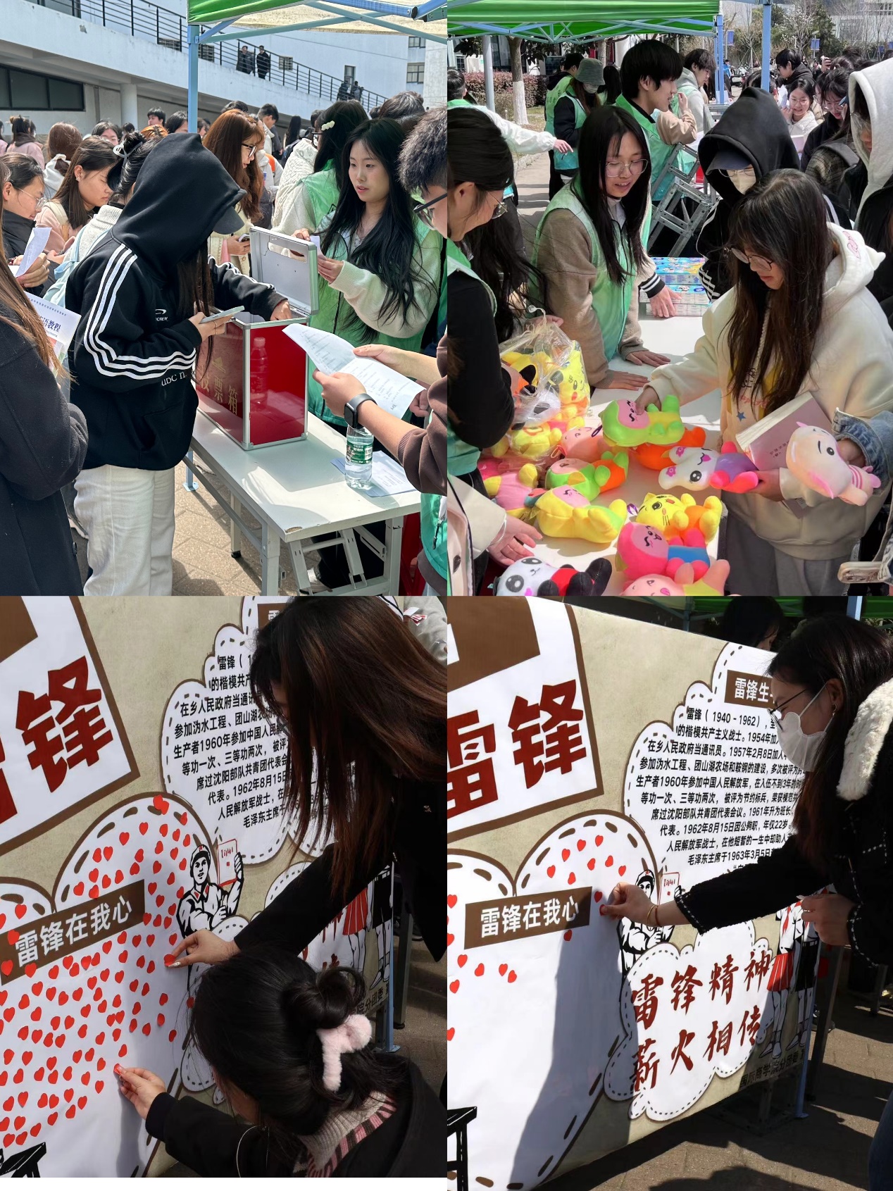 本次活动主要内容为关于雷锋精神的有奖问答。活动现场布置了雷锋生平简介和雷锋精神的宣传海报,同学们看完文字介绍后可抽题进行回答,答对一道题便可以获得一枚爱心贴纸,根据爱心贴纸的数量,可兑换相应奖品,爱心贴纸也将留在宣传海报上作为纪念。