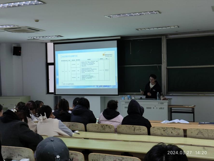 讲座开始前,祝祎玮主任为同学们介绍了企业宣讲的重要性,并请同学们认真听讲,分析个人性格与岗位特点,为后续实习招聘会做好准备。