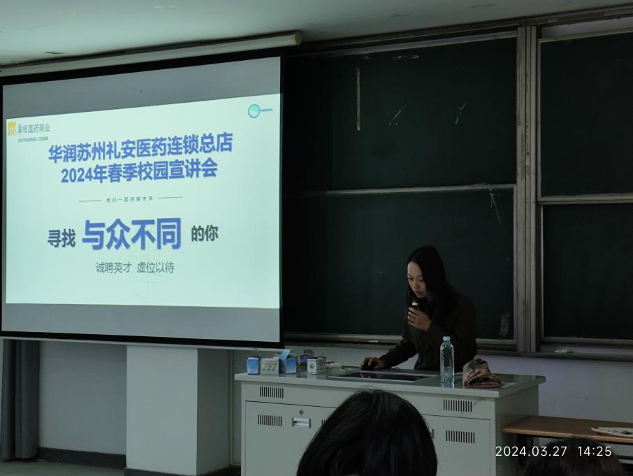 本次会议邀请了来自江苏华润医药有限公司的人事招聘负责人沈经理和王经理,为22级药品经营与管理专业学生做企业宣讲。
