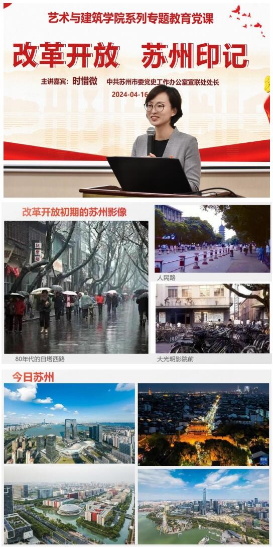 4月16日,艺术与建筑学院党总支组织开展“党史学习教育进校园,红色精神薪火传”活动,邀请中共苏州市委党史工作办公室宣联处长时惜微同志来我院开展《改革开放 苏州印记》专题教育党课。艺术与建筑学院全体党员、教职工、学生党员及入党积极分子参加会议。会议由党总支书记、副院长施建平主持。