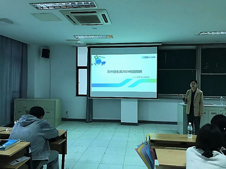 作为全亿健康产业集团的子公司,苏州健生源医药连锁有限公司在2012年-2016年期间多次进入中国药店最具价值品牌排行榜百强企业。人事部负责人夏经理就公司发展概况、主打业务品牌及人才培养计划三个板块率先作报告分享。其表示对于实习工作,苏州健生源将提供优越的岗位实习机会和薪资福利待遇,欢迎同学们选择全亿,加入全亿。