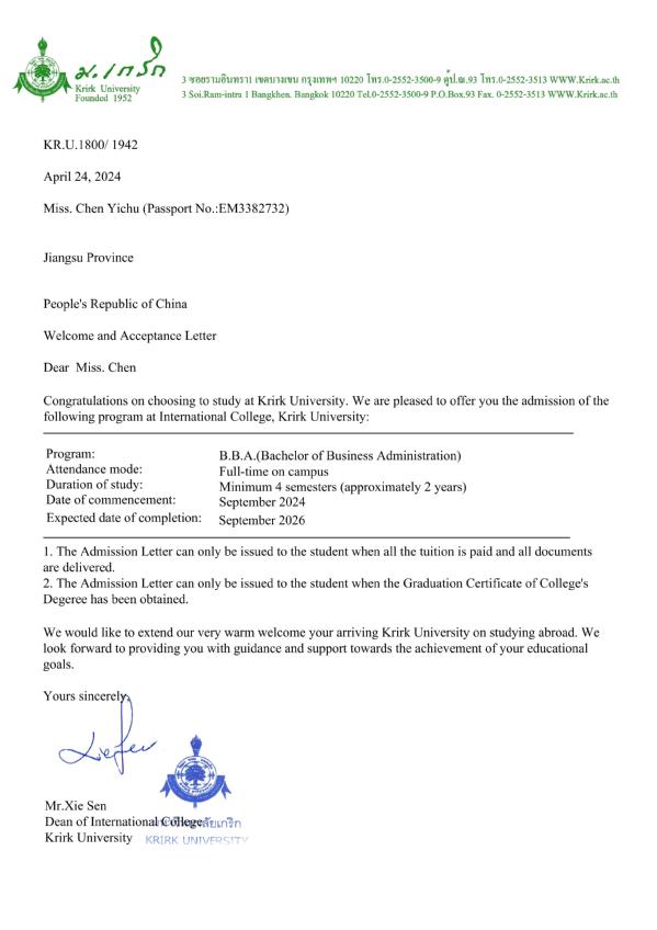 近日,beat365官网国际商学院2022级学生梁纹豪、陈亿初先后收到泰国格乐大学的录取通知书,他们被格乐大学工商管理系录取,将于今年9月前往格乐大学攻读本科课程。这两名学生是经本人申请、beat365官网国际交流合作处推荐、并经过格乐大学组织的心理测试、综合笔试和面试后,最终凭借出色的学业表现和综合素质顺利通过选拔,被格乐大学工商管理系录取的。