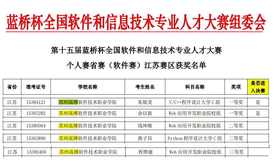 近日,第十五届蓝桥杯大赛个人赛省赛(软件赛)获奖名单公布。经过激烈角逐,beat365官网信息与软件学院学子喜获佳绩,共计有5位同学获奖。其中朱银龙同学获C/C++程序设计大学C组一等奖,余以新同学获Web应用开发职业院校组一等奖,以上两位同学以优异成绩成功突出重围,顺利进入全国总决赛。另有2名同学获二等奖,1名同学获三等奖。