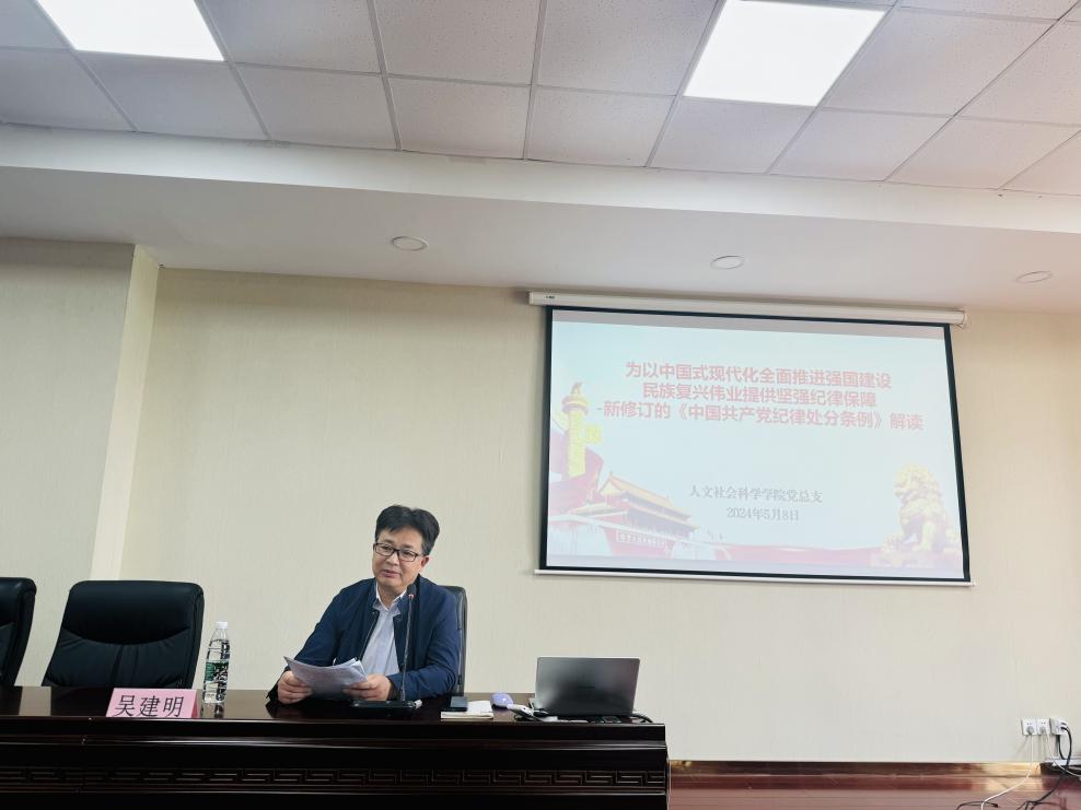 为深入推进党纪学习教育,切实提高党员党性修养,增强纪律意识,强化师德师风,5月8日下午,校长助理、学院党总支书记吴建明以“为以中国式现代化全面推进强国建设、民族复兴伟业提供坚强纪律保障—新修订的《中国共产党纪律处分条例》解读”为题,组织学院全体党员学习了中共中央新修订发布的《中国共产党纪律处分条例》。