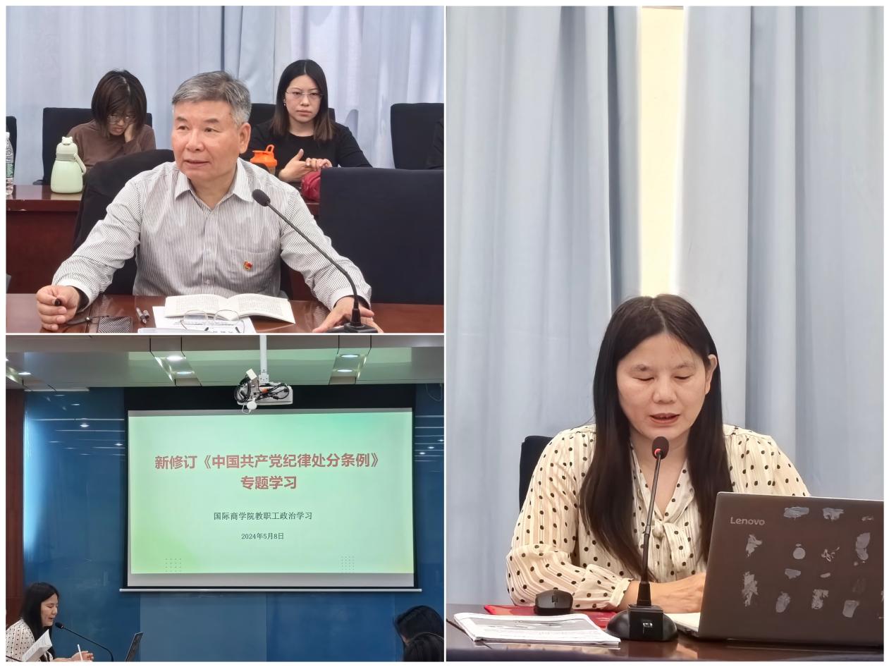 严格自律常自省,初心不忘岁月长。本次举办的《中国共产党纪律处分条例》专题学习辅导,拉开了国际商学院广大党员、干部、教师为期四个月的党纪专题学习教育的序幕。国际商学院全体教职工将以此为契机,努力提高对党章党规党纪的认知水平,做到学纪、知纪、明纪、守纪,改进工作作风、强化师德师风、忠诚干净担当,为推进学院的高质量发展提供坚强的纪律作风保障。(国际商学院党总支供稿)