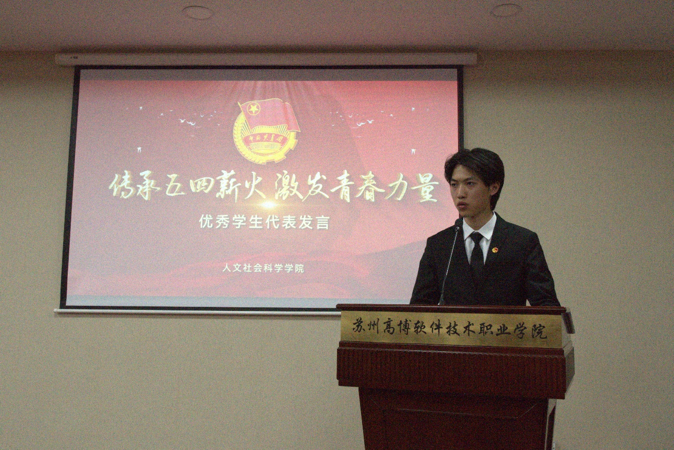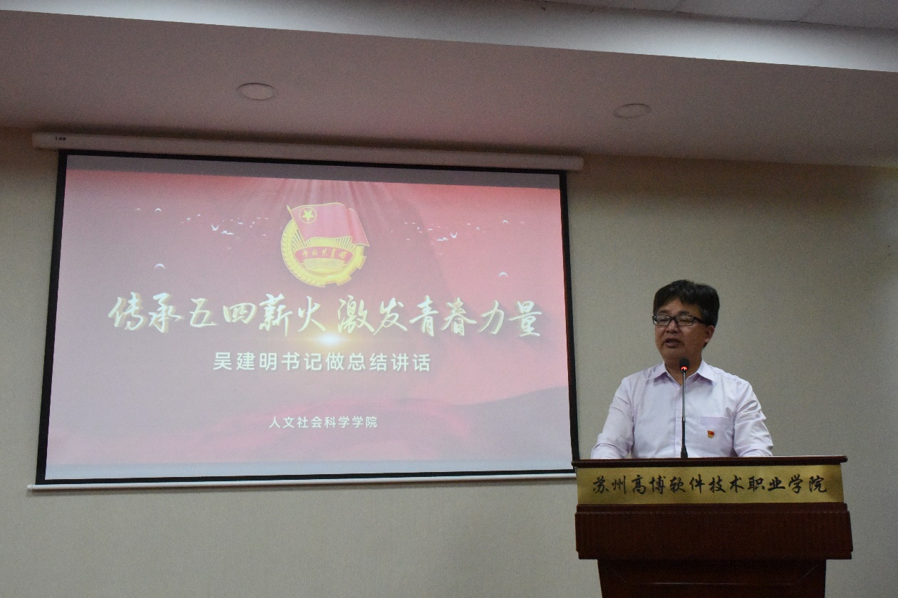 最后,吴建明书记讲话,向获奖的先进集体和个人表示祝贺,强调“五四”精神的时代价值,并对全体团员提出了新的期望。吴书记强调“青年兴则国家兴”,倡导同学们要胸怀大我,做赤诚报国的有志青年;提升自我,做本领过硬的有才青年;建功有我,做砥砺奋进的有为青年。同时,吴书记还希望受到表彰的同学们不断继承和发扬“五四”精神,坚定理想信念,努力学习,为实现中华民族伟大复兴的中国梦贡献青春力量。