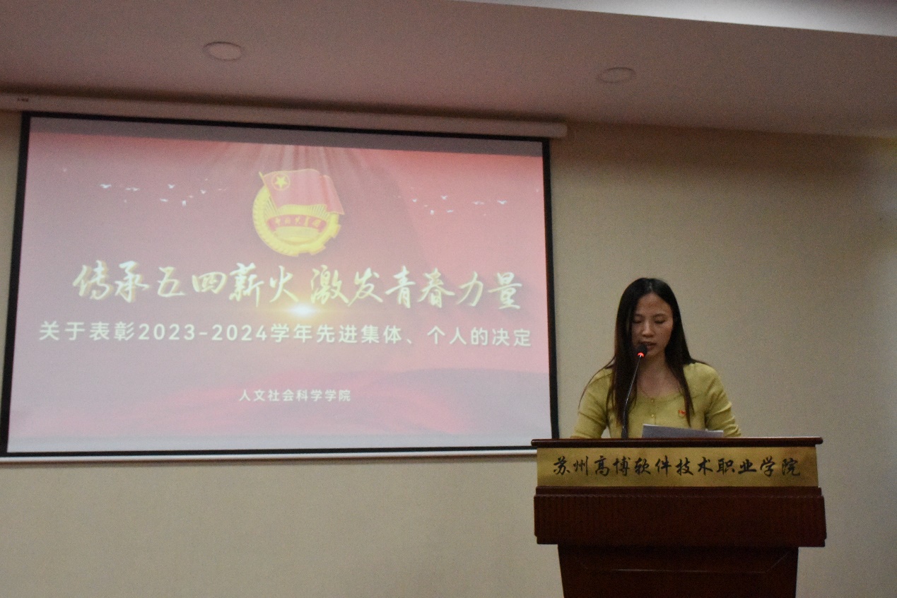 5月16日,人文社会科学学院2023—2024学年“传承五四薪火,激发青春力量”五四颁奖典礼在行政楼215会议室隆重举行,校长助理、人文学院党总支书记吴建明,院学工办主任赵雪飞老师、分团委吴敬德老师出席典礼,我院学生会成员和学生代表参加了此次活动。
