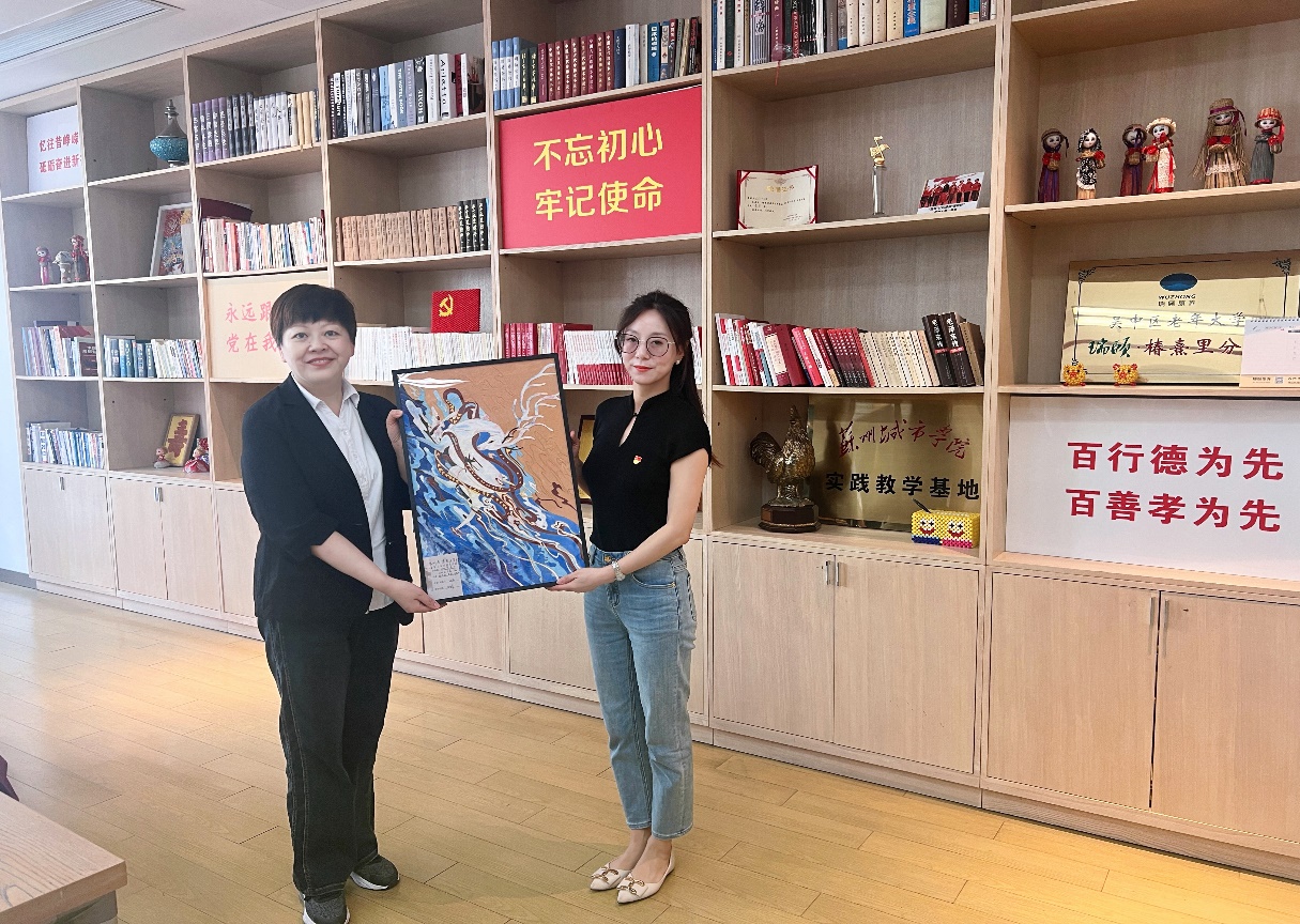 医学院教工党支部书记张婷走进瑞颐康养社区与老人亲切交流,了解他们的生活与健康情况,为瑞颐康养社区赠送了幼教系学生的景泰蓝工艺画作品,一声问候,两句细语,洋溢出浓浓情谊。