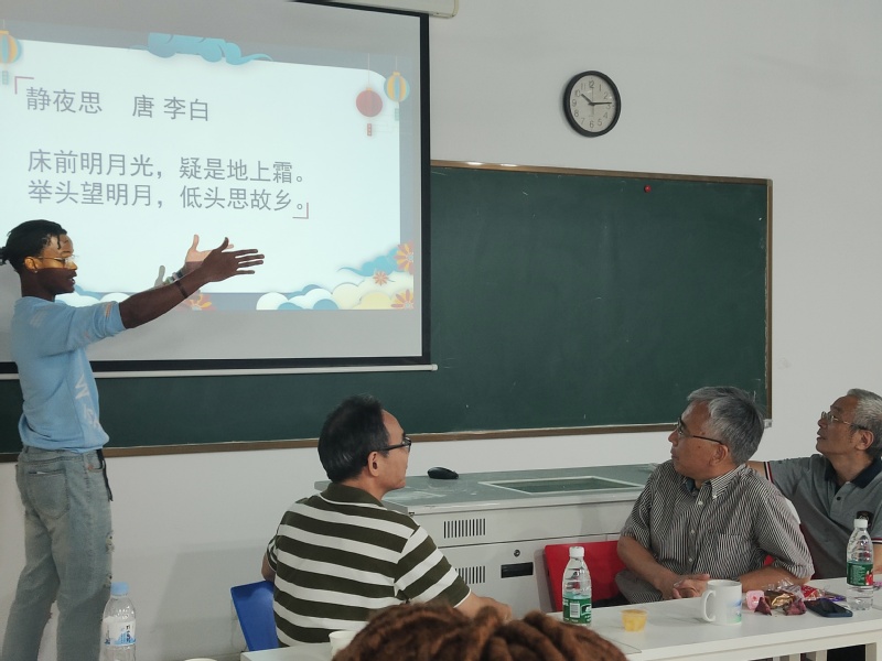 活动开始后,首先由洪庆福教授向留学生们介绍了中秋节的起源,讲述了嫦娥奔月的故事以及宋代著名文学家苏轼的词作《水调歌头明月几时有》,带领大家朗诵并吟唱了这首歌。留学生们听得津津有味,对中国的中秋节充满了好奇。大家一边品尝月饼,一边交流互动,留学生们也介绍了各自国家的传统节日文化。在热烈的掌声中,2023级留学生代表Dante吟诵了我国唐代大诗人李白的诗作《静夜思》,表达了他对家乡的思念之情和对中国传统文化的热爱。
