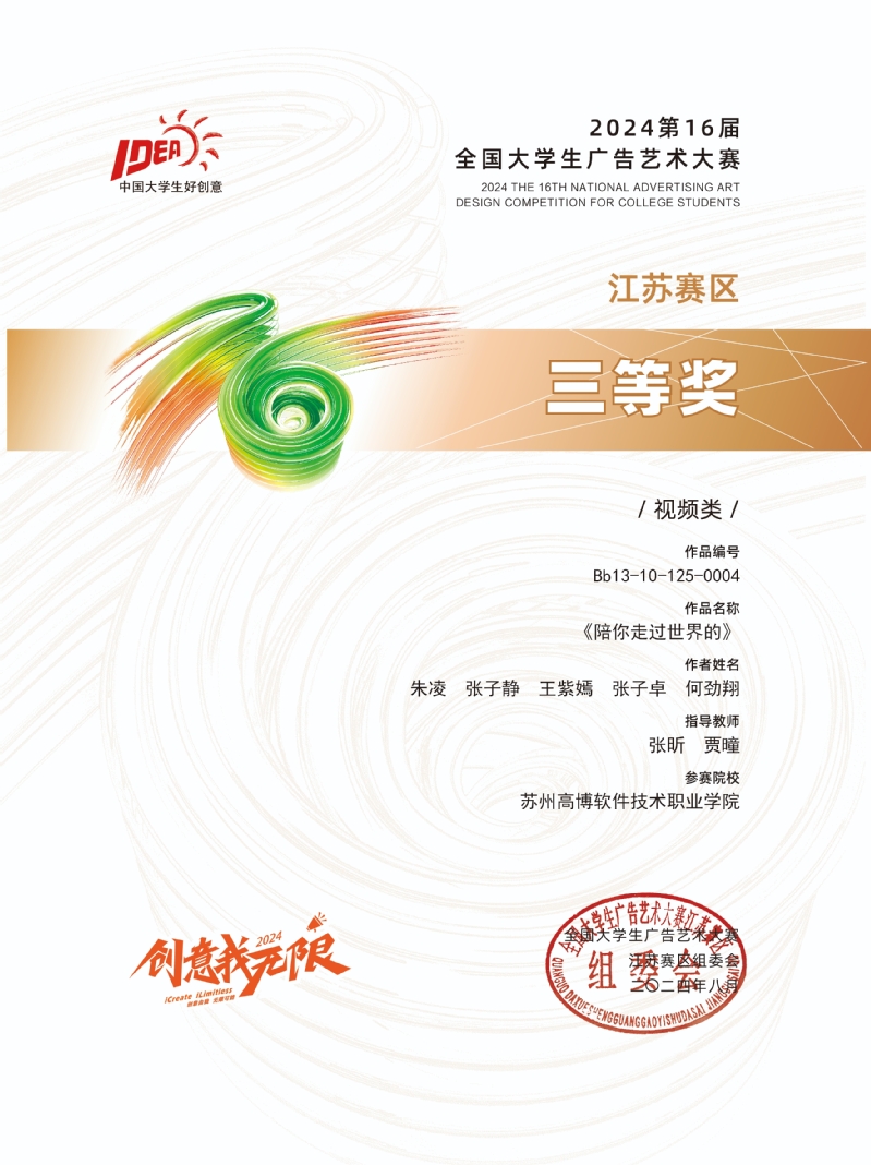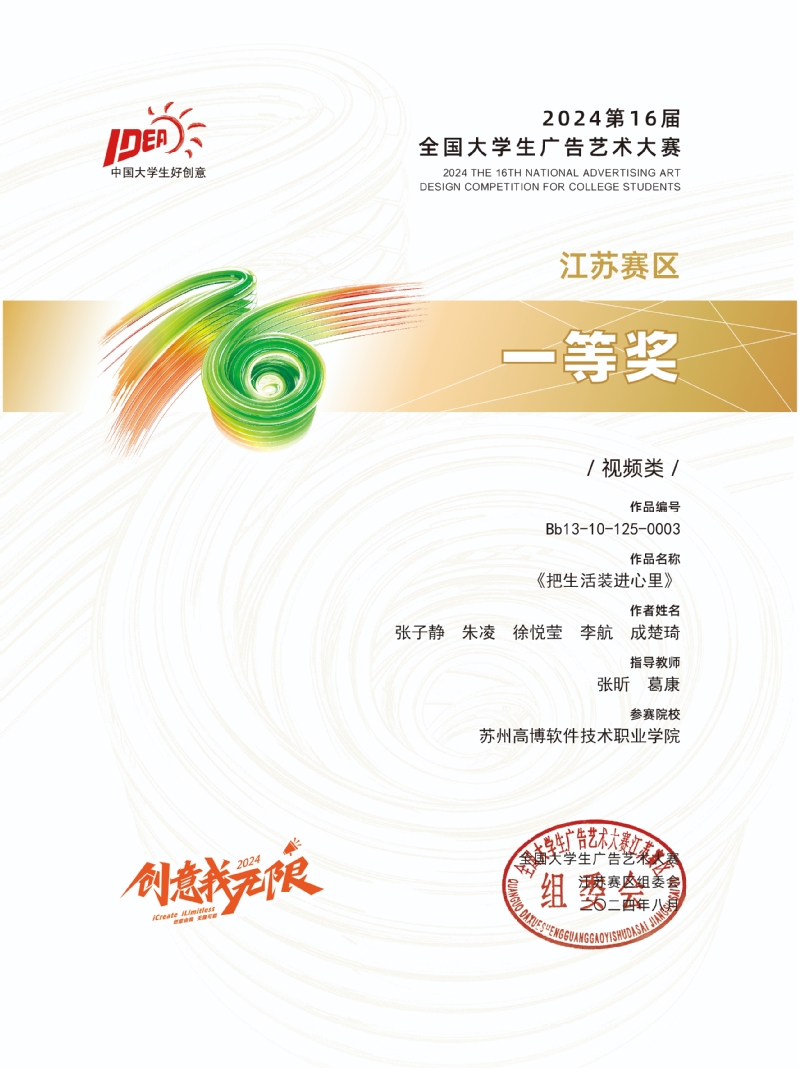 在近日揭晓的“创意我无限”第16届全国大学生广告艺术大赛中,beat365体育亚洲官方网站艺术与建筑学院师生经过4个月的努力,凭借独特的创意构思、深刻的主题挖掘和精湛的艺术表现力,从众多参赛作品中脱颖而出,其中张子静、朱凌、徐悦莹、李航、成楚琦创作的,张昕、葛康老师共同指导的学生作品《把生活装进心里》获江苏赛区视频类一等奖、全国视频类三等奖,朱凌、张子静、王紫嫣、张子卓、何劲翔创作的,张昕、贾曈老师共同指导的学生作品《陪你走过的世界》获江苏赛区视频类三等奖、全国视频类三等奖。