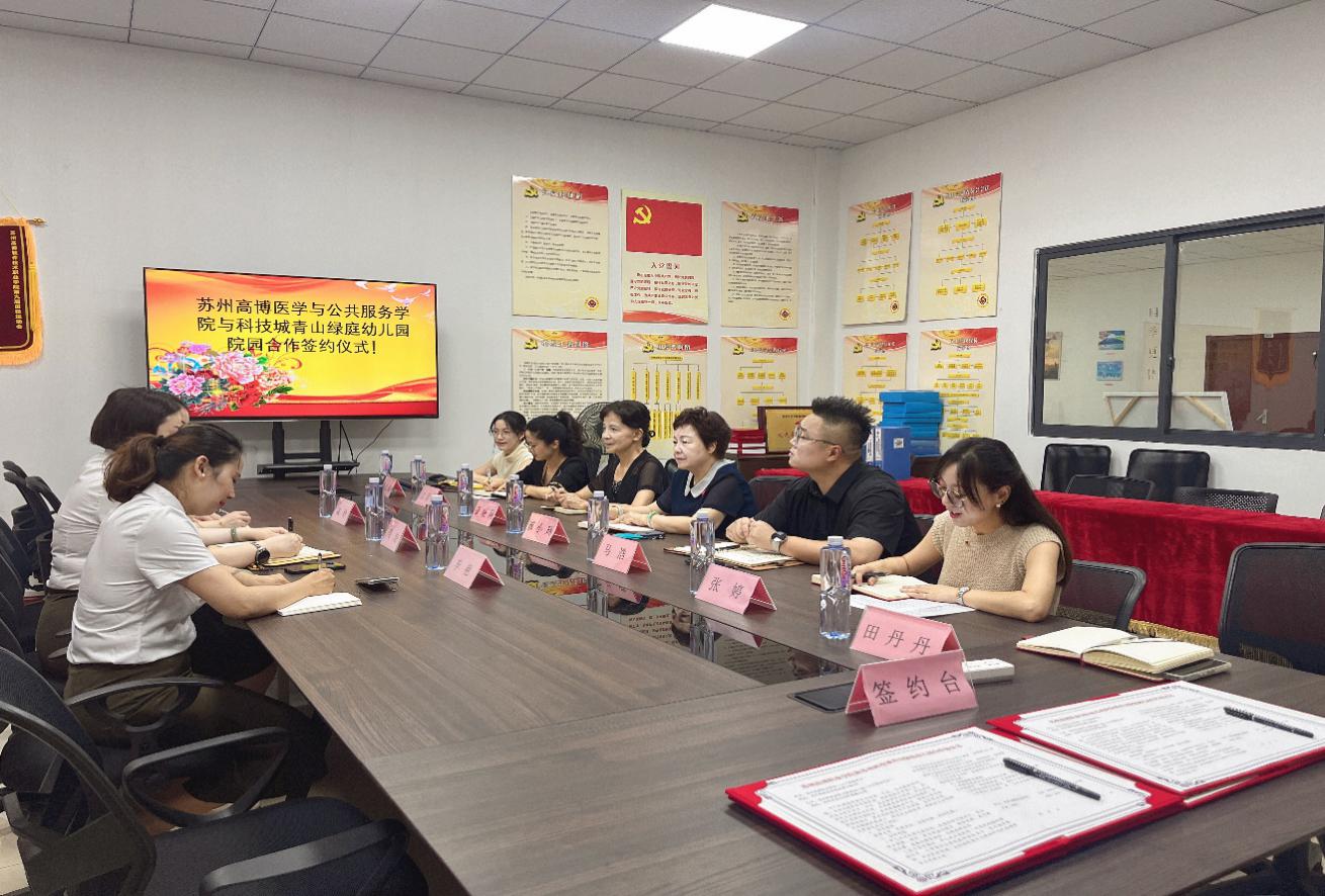 9月19日上午10点beat365体育亚洲官方网站医学与公共服务学院幼儿教育系与苏州科技城青山绿庭幼儿园在学院会议室举行校-园合作签约及揭牌仪式。苏州科技城青山绿庭幼儿园园长周洁、副园长黄玲、副园长李艳,beat365体育亚洲官方网站校长特别助理、医学院名誉院长薛小玲、校发展办主任马浩、医学院副院长章晓莉、医学院幼教系系主任张婷、幼教系实践教学管理办公室主任沈素嫣、幼教系艺术教研室主任田丹丹、幼教系学前教育专业负责人刘若诗出席活动。会议由幼教系系主任张婷主持。