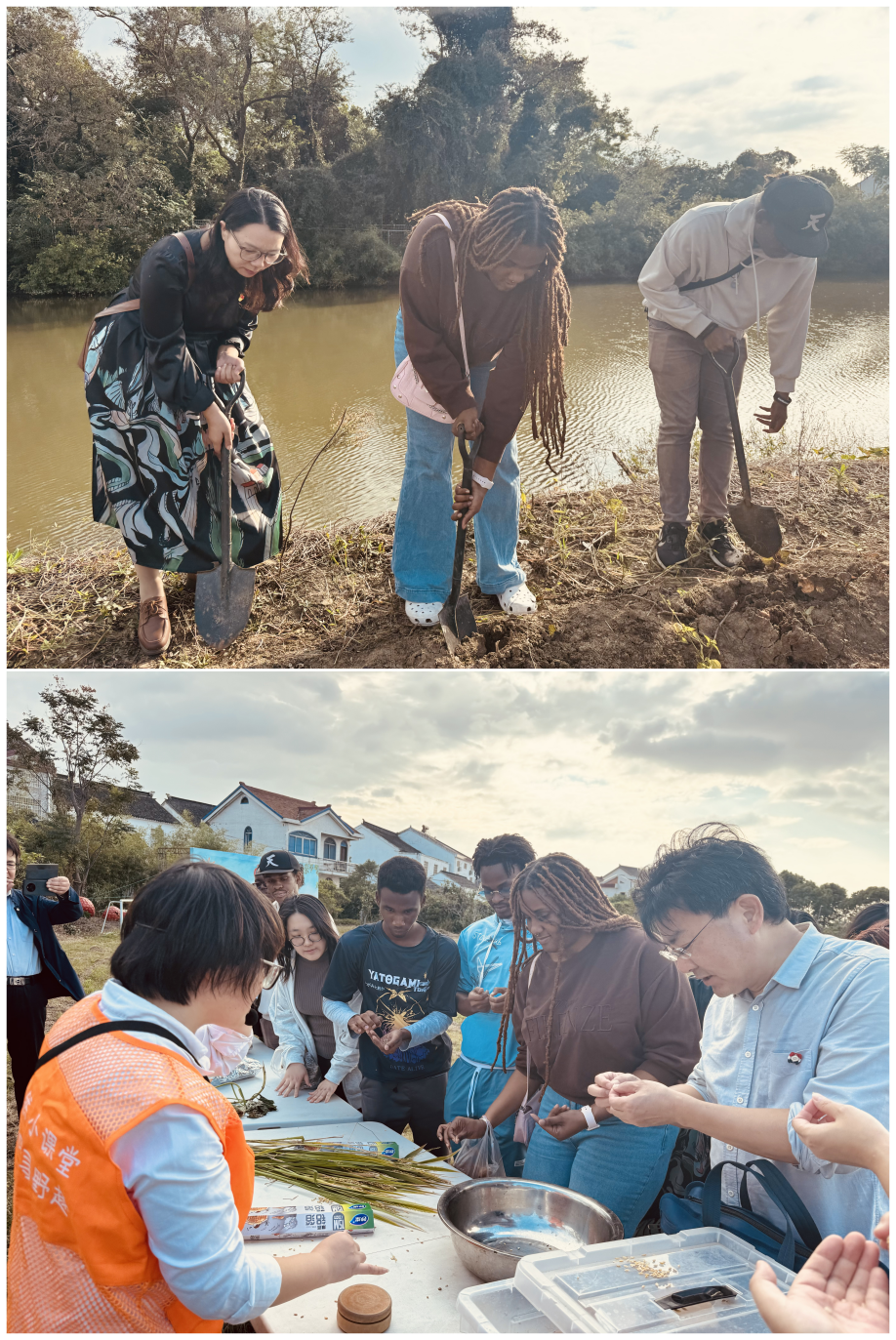 随后,众人亲自动手挖山芋、手作米,深度体验农耕生活。在劳动过程中,老师们和同学们相互协作、共同努力,不仅增进了彼此之间的感情,还深刻体会到农民的辛勤劳作和粮食的来之不易,也使国际留学生们领略了中国农耕古韵的文化魅力。