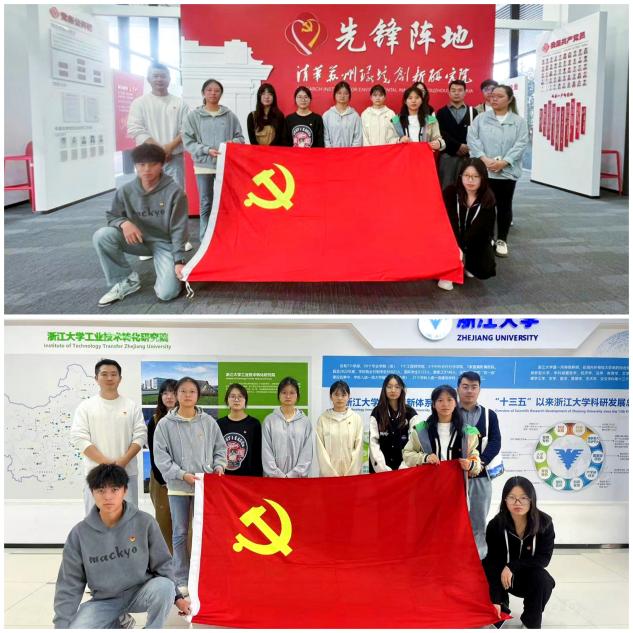 为全面贯彻落实党的二十届三中全会对深化教育科技人才体制机制一体化改革作出的重要部署,更好地培养教育学生党员,利用好学校周边的教育资源,深化学校和社区、科研院所的联动。在此背景下国际商学院学生党支部与青山绿庭社区党支部组织共建活动,艺术与建筑学院学生党支部共同参与,组织入党积极分子参与社区筹划的“青山寻宝计划”系列活动,该活动旨在引导社区内单位互相交流学习,分享党建教育资源。10月23日下午,由国际商学院学生党支部书记蒋运奇和辅导员马俊涛老师带队,国际商学院学生党支部七名积极分子以及艺术与建筑学院的两名积极分子,与社区支部成员汇合一同前往清华苏州环境创新研究院和浙江大学苏州工业技术研究院两家科研院所进行参观学习。