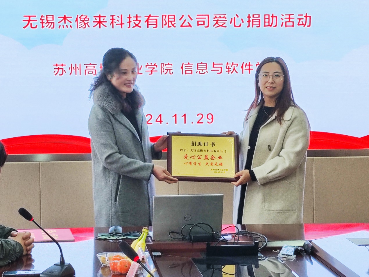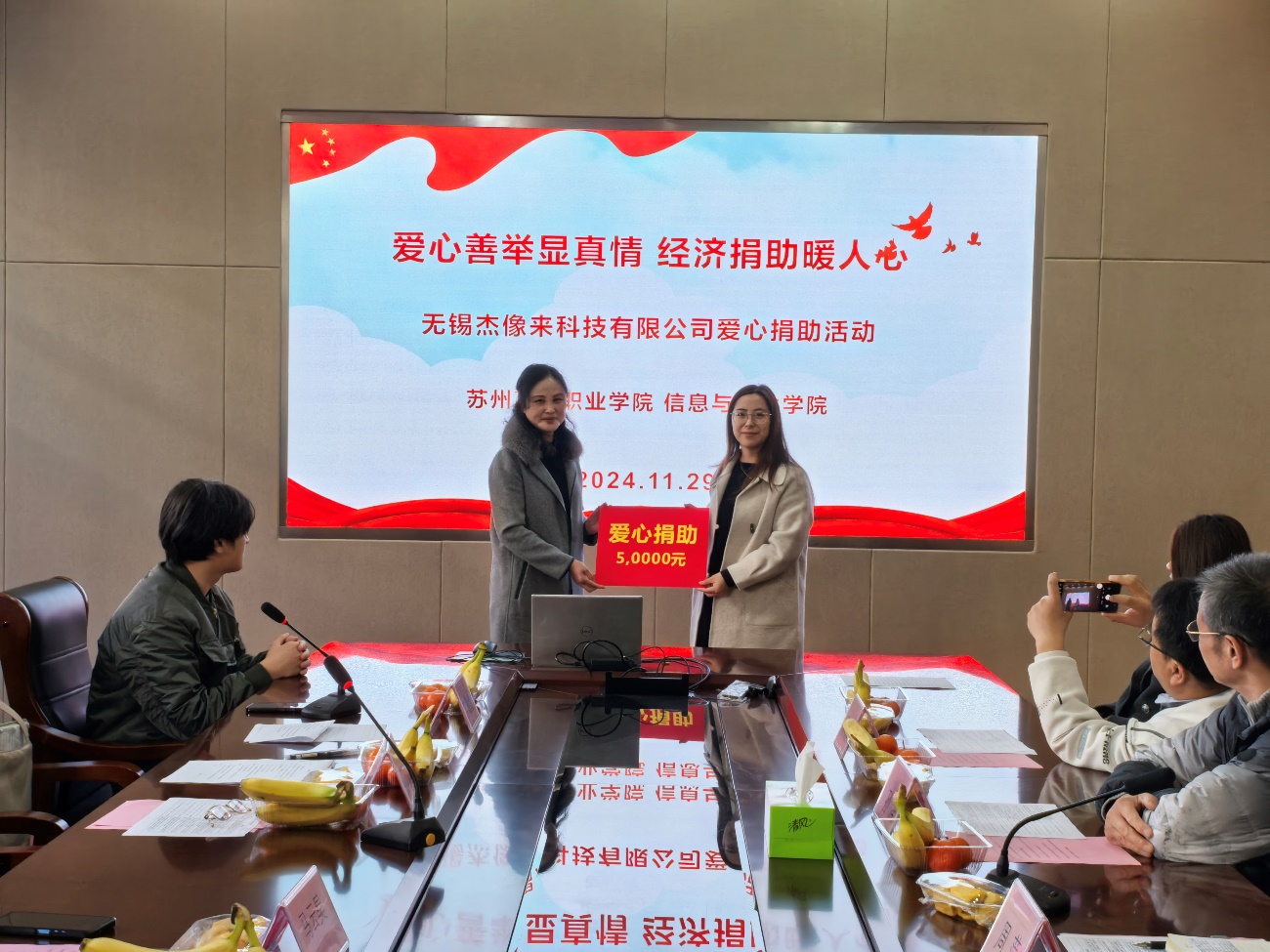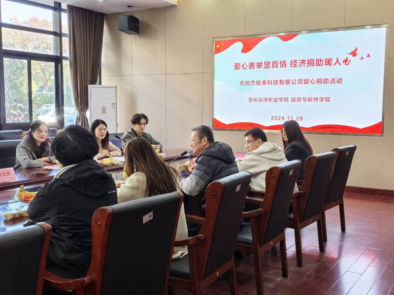 11月29日,无锡杰像来科技有限公司向高博职业学院信息与软件学院捐助五万元,资助beat365官网信息与软件学院经济困难学生,捐助仪式在beat365官网行政楼一楼会议室举行。学校学生处周处长,信息与软件学院党组成员,受助学生参加了爱心捐助,捐助活动由信息与软件学院李嫚嫚老师主持。