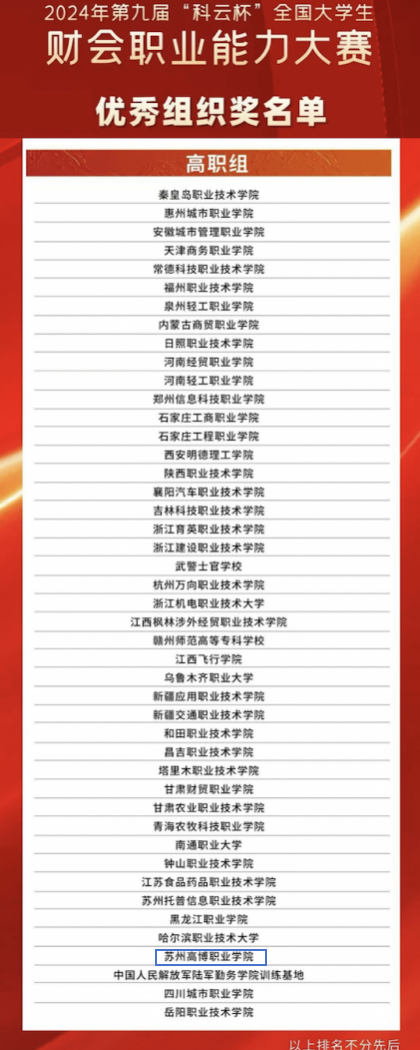 “科云杯”全国大学生财会职业能力大赛由中国商业会计学会主办,厦门科云信息科技有限公司承办,入选《2023全国普通高校大学生竞赛分析报告》竞赛目录。该比赛主要考察数字化时代财会人员业财税信息处理技能、智能化财务应用技能两个方面的工作。该比赛高职组的全国决赛共有来自全国100所高职院校的100支队伍参加。