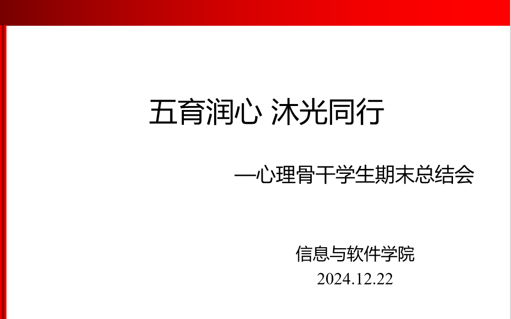 为帮助学生干部强化工作技能,提升综合素质,促进心理健康教育工作发展,信息与软件学院2023、2024级各班心理骨干学生期末总结会于2024年12月22日晚上19:00至20:00在12-515教室召开。本次活动由信息与软件学院心理辅导员李嫚嫚老师支持。