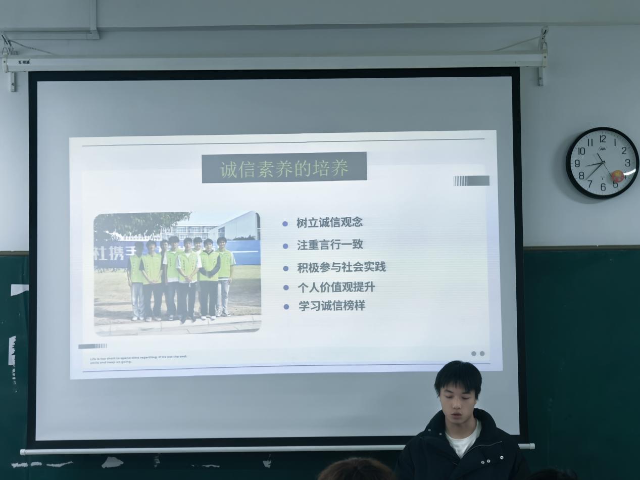 “诚者,天之道也;思诚者,人之道也。”在公开课上,黄宇航同学以这句古诗词为引子,巧妙地引出了本次公开课的主题。他通过讲述历史上和现实中的诚信故事,展示了诚信在不同历史时期、不同社会背景下的表现形式和重要作用,引导学生们深入思考诚信对于个人成长、社会和谐以及国家发展的重要意义,强调了诚信是每个人应当坚守的道德底线,也是社会文明进步的重要标志。