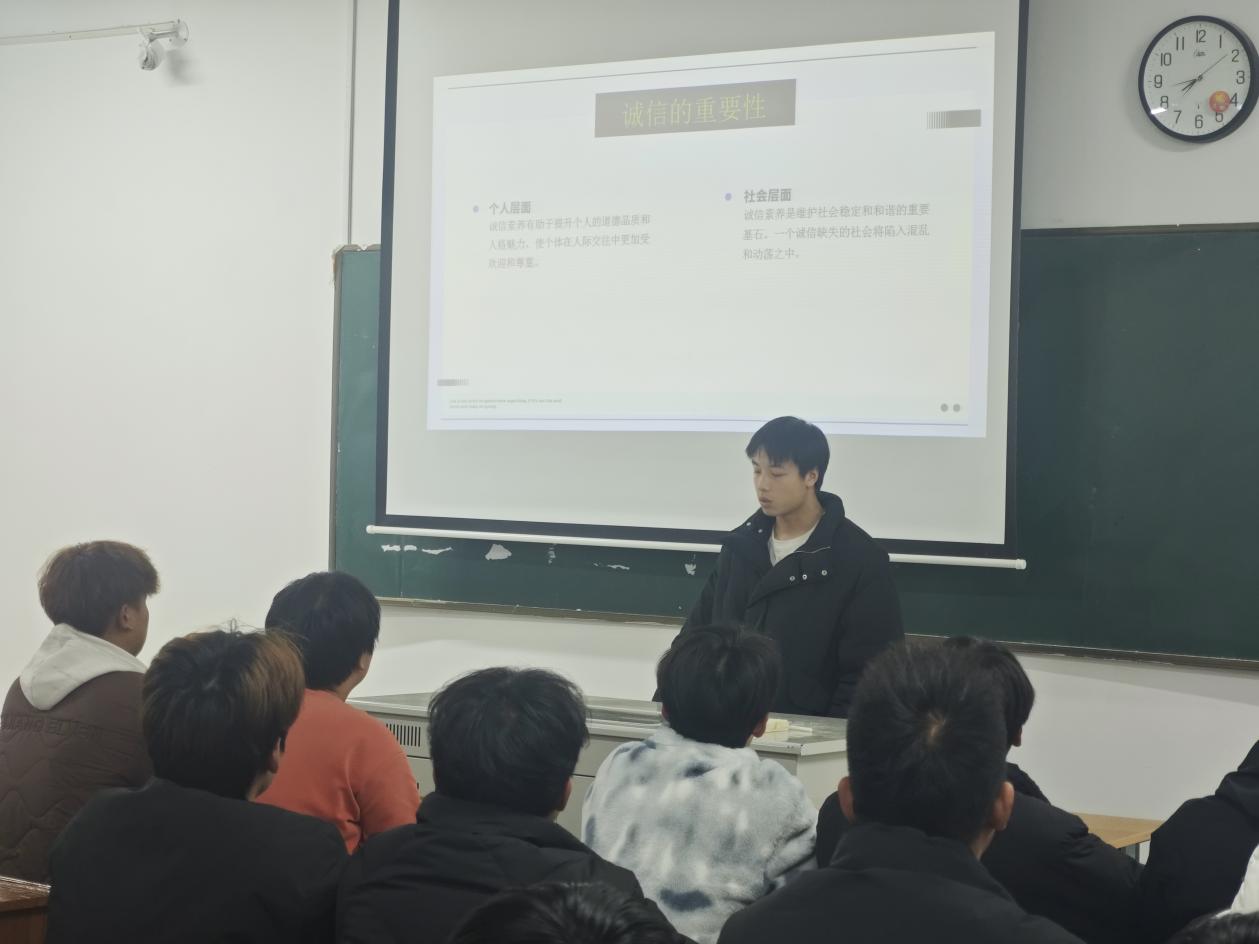 为了进一步加强学生思想道德建设,弘扬诚信文化,提升学生的综合素质。12月25日晚6:30,机电工程学院分团委在教学楼12-419开展了以“以诚守信,共筑未来”为主题的素养公开课。公开课由学生会干部黄宇航主持。