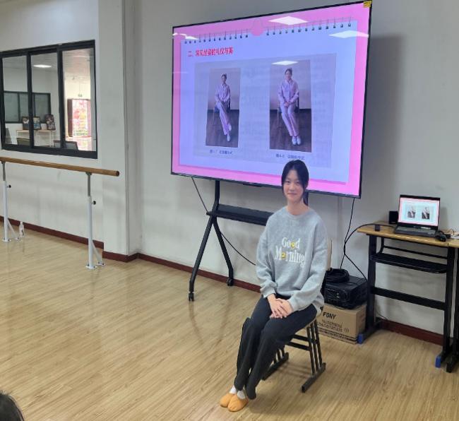 与之相衔接的是“护理礼仪与形体训练”的模块,作为护理专业的学生,护理礼仪是必不可少的一种职业礼仪,是护理人员素质、修养、行为、气质的综合体现,因此在教学过程中,黄琬捷老师首先通过基本姿态与柔韧性训练、身体协调性训练等引导学生塑造优美的身体形态,而后再重点围绕护士的仪表礼仪和工作礼仪进行讲授和实操。学生在结课时分组展示了常见站姿礼仪、坐姿礼仪、手势礼等,充分体现了护士工作中举止礼仪的美,也直观地理解了护理礼仪的重要性,在未来的学习、实践、乃至工作中,学生们都能更加注重自身的礼仪修养,以良好的职业形象、亲切的语言、优雅的举止为患者提供优质的护理服务。