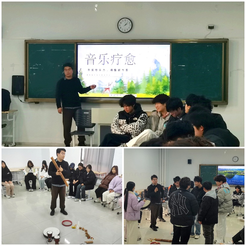 12月26日中午,第二场“自我舒压力,调整新节奏”音乐疗愈团辅,也引起了同学们的浓厚兴趣。马俊涛老师为同学们带来了多种新奇有趣的乐器,学生们纷纷动手尝试,敲击、拨动不同的乐器,随着舒缓的音乐旋律,大家也逐渐放松下来。活动中,学生们不仅体验到了音乐的疗愈效果,还通过身体的延展和音乐节奏的配合,进一步释放了紧张的情绪,舒缓了身体和心灵的压力。