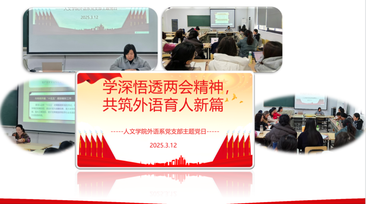 3月12日下午人文学院外语系党支部召开了“学深悟透两会精神,共筑外语育人新篇”的主题党日学习活动。此次活动旨在深入学习2025年全国两会精神,特别是关于教育改革的论述,并结合外语学科的特点,探讨如何在新时代背景下,培养具有全球视野、家国情怀的国际化人才。全体外语系教师参加了这次政治学习。