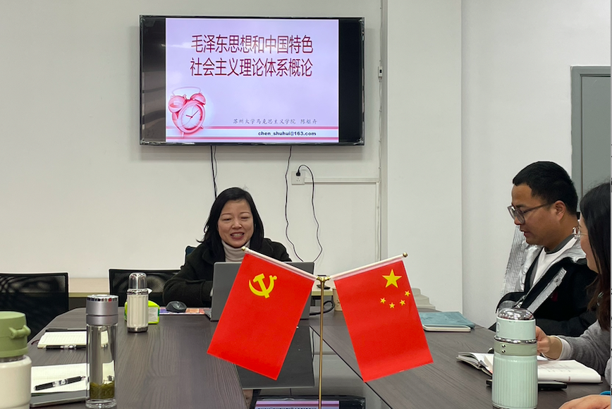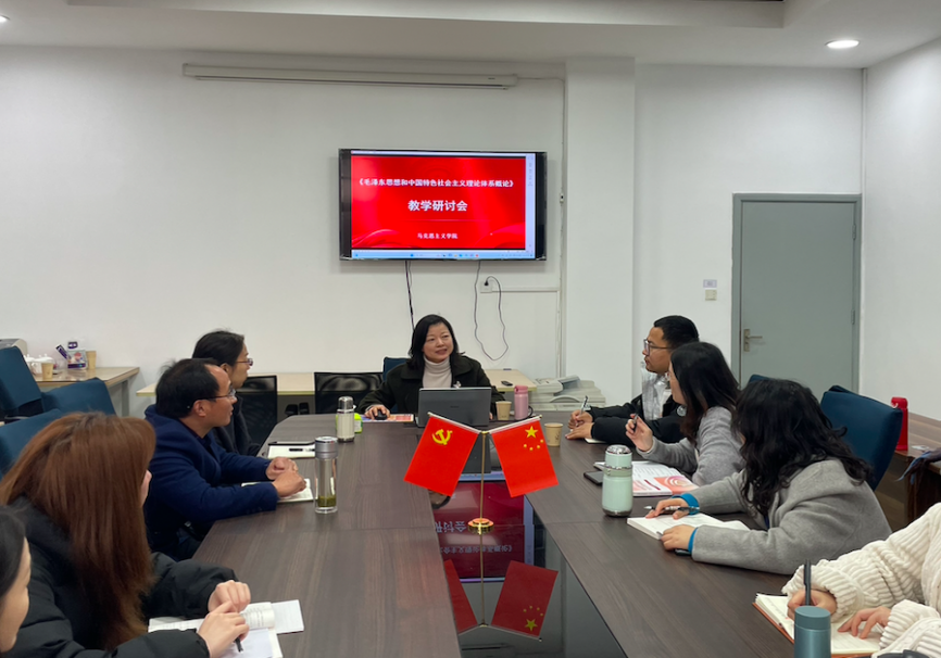 为进一步做好本学期“毛泽东思想和中国特色社会主义理论体系概论”(以下简称“毛概”)”课程教学工作,3月14日下午,马克思主义学院召开“毛概”课教学专题研讨会。本次研讨会特邀苏州大学马克思主义学院“毛概”教研室主任、硕士生导师陈枢卉教授莅临指导。马克思主义学院院长吴歧范及全体思政教师参加了此次研讨会,会议由思政教研室主任蒋婧杰主持。会议聚焦教材分析、教学设计优化及高职院校思政课教学创新等多个方面,通过专家引领、说课展示与互动研讨,为提升思政课教学实效注入新动能。