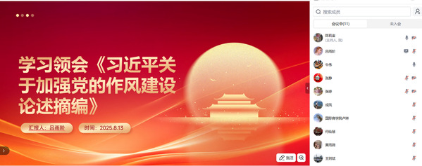 为持续深化理论武装,筑牢党员思想根基,8月13日,国际商学院教工第一党支部依托线上平台,组织全体党员开展主题党课学习活动。吕雨阶同志担任主讲,围绕《习近平关于加强党的作风建设论述摘编》进行了系统深入的解读。