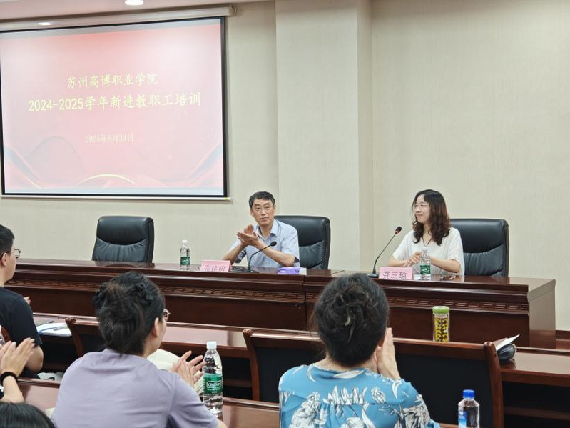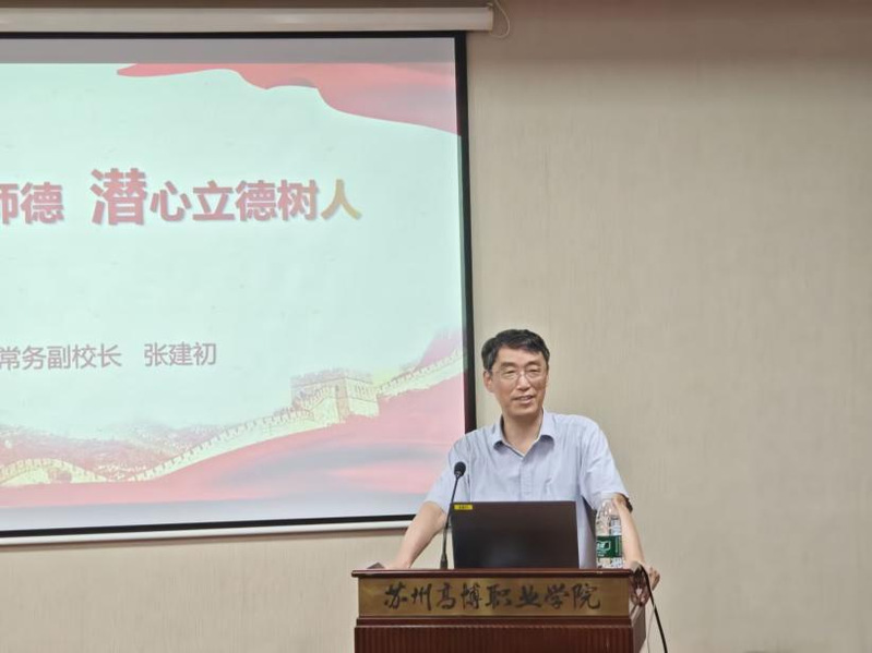 8月24日上午,培训开班仪式在行政楼215会议室举行。仪式由人事处处长、教师发展中心主任龚三琼主持,学校常务副校长张建初发表动员讲话。张校长代表学校对全体新教师表示热烈欢迎,并以“弘扬高尚师德 潜心立德树人”为主题,围绕学校办学历程与未来发展展开系统阐述。他详细介绍了学校的举办者——江苏吴中集团,强调吴中集团作为多元化大型企业集团,以深厚的教育情怀和资源实力为学校发展提供坚实保障;讲述了朱秀林校长的学术成就与治校理念,突出朱校长在学校发展战略规划、师资队伍建设、校园环境改善等方面所作出的卓越贡献;同时介绍了学校由大量来自苏州大学、南京理工大学等知名高校和行业企业的专家教授组成的高水平、专兼结合的师资队伍。张校长通过分享校内师德师风模范的先进事迹,明确“师德是教师立身之本、从教之基”的理念,引导新教师树立正确的教育观,增强职业使命感。