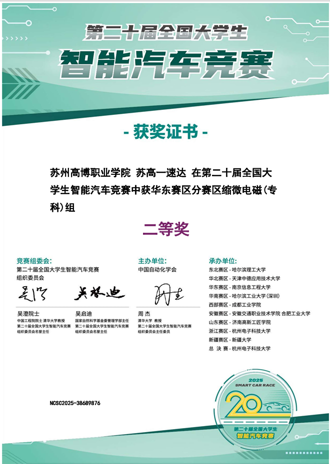 2025年7月下旬,第二十届全国大学生智能汽车竞赛华东分赛区比赛中,我院实现了一项令人振奋的历史性突破。由孙涌院长、李月峰副院长统筹指导、黄冬丽老师具体带队,学生李昆鲁、吴弈泽、邹德志组成的“苏高一速达”代表队,首次参加缩微电磁组竞赛即荣获华东赛区二等奖。在华东区缩微电磁组别70多支参赛队伍中总排名第25名,高职组排名第3名,在江苏省内高职院校中成绩排名第2名。