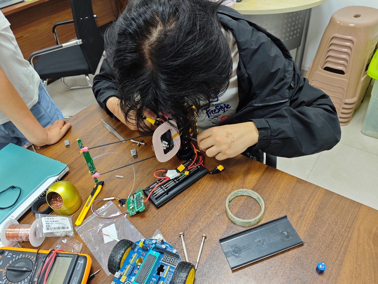 指导老师黄冬丽为此付出了超常的心血,她全程陪伴团队成长,从技术指导到生活关怀无微不至。还经常利用晚上和周末时间上网查阅相关资料,自费购买专业工具。特别是在比赛前一周智能车PCB板突然烧毁的危急时刻,黄老师沉着应对,第一时间联系多方资源,带领学生连续奋战72小时,最终化解危机。这种敬业精神和专业素养,令人肃然起敬。辅导员老师们同样付出了大量心血。他们不仅要做好学生的思想工作,还要协调备赛期间的各种事务。特别是在比赛前夕,辅导员团队甚至排班轮流值守,确保学生安全,为他们提供后勤保障。