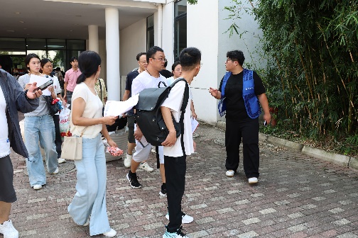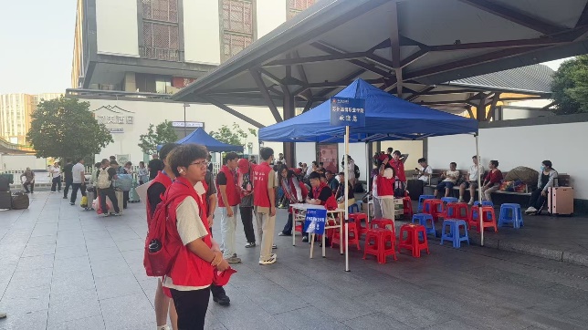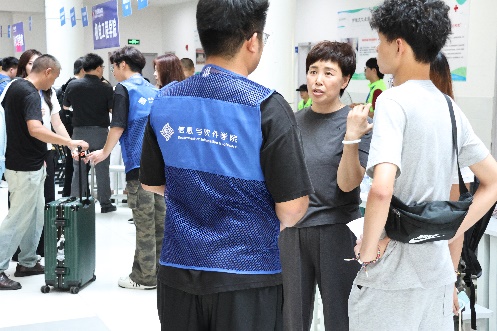 为保障新生及家长顺利抵达校园,学院接站组提前规划、精准发力。火车站组在赵志敏老师的带领下,早早驻守苏州火车站(北广场汽车站),搭建临时服务点,主动为新生及家长提供路线指引、行李搬运等服务,实时解答交通换乘、校园布局等疑问,确保每一位从火车站出发的新生都能安全、便捷地抵达学校。校内接站组在组长蔡婷老师的统筹下,于校园一号门设立接待点,志愿者们热情上前接过新生行李,引导新生及家长避开人流高峰路线,快速前往招生大厅办理报到手续,实现“校门到报到点”的无缝衔接。