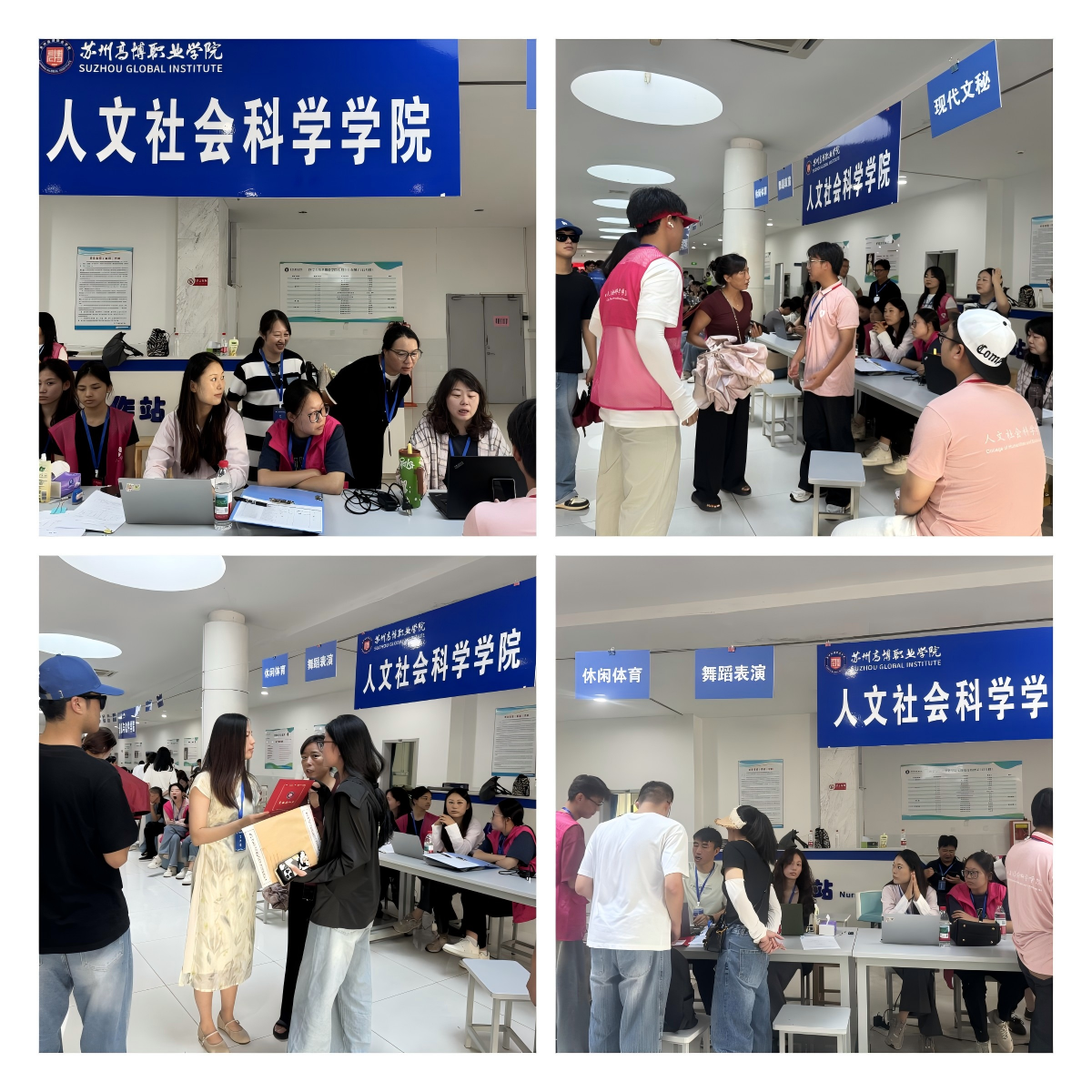 教学楼西大厅的注册报到现场,教师们认真核对新生录取通知书、缴费单,为新生办理学籍注册并加盖注册章,同时耐心解答中文、文秘、休闲体育、舞蹈表演四个专业的培养方案、课程设置等咨询问题;学生志愿者主动上前,为新生发放报到流程表,指导填写规范,并贴心引领新生前往缴费处及宿舍报到处,让新生 “少跑路、好办事”。